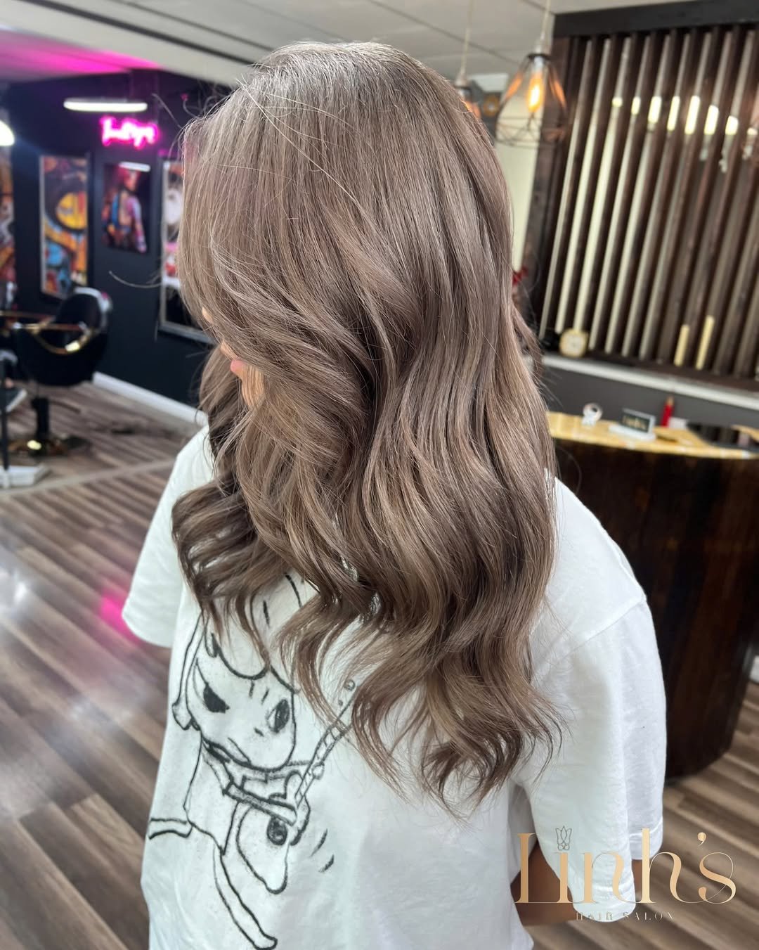 @linh_hair_salon_ brings us a silvery-taupe ash brown that feels plush and sophisticated — like the color version of cashmere. It’s perfectly cool-toned but still soft, with a natural shimmer that keeps it from ever feeling flat.