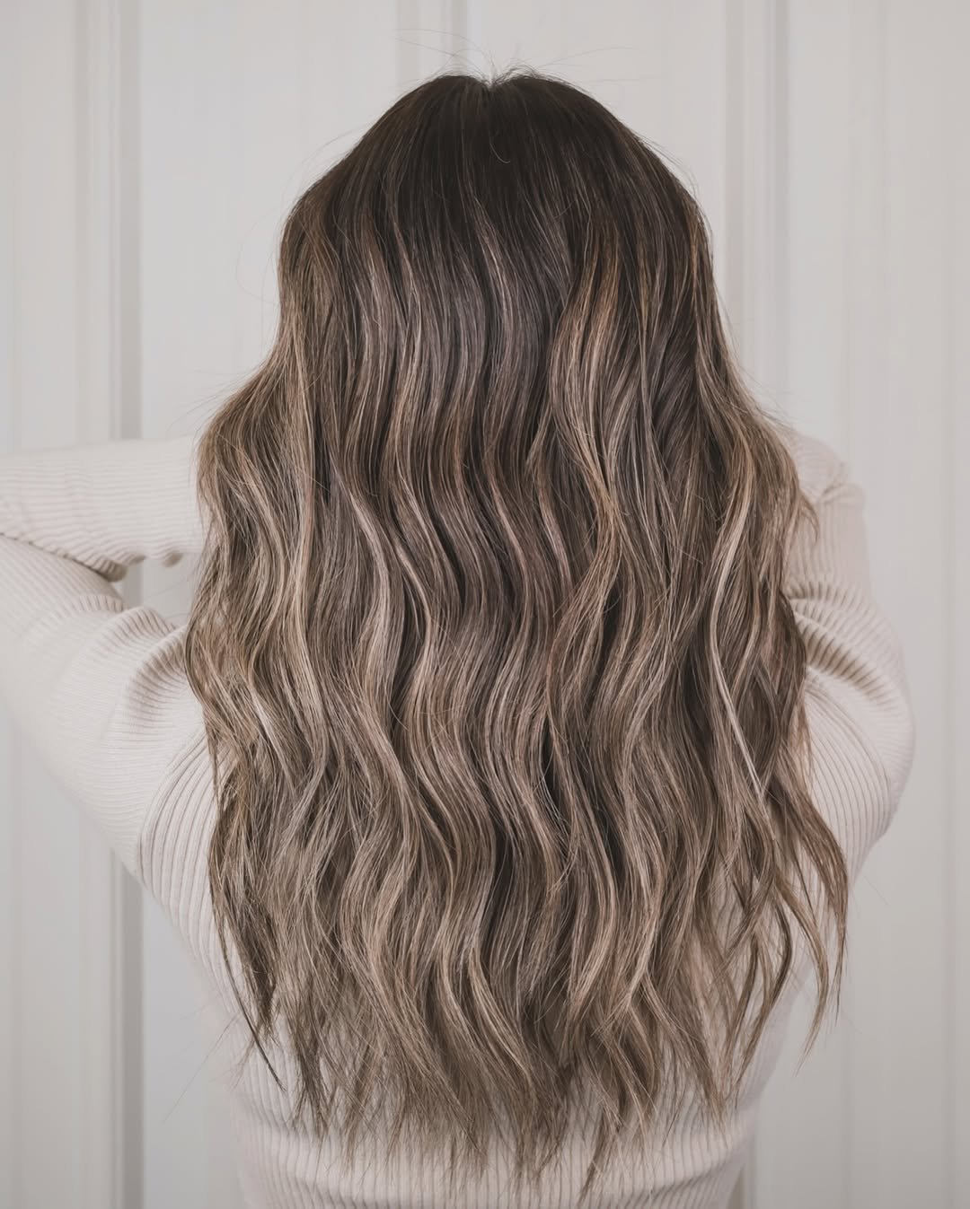 From @jaxsalons, this cocoa-toned ash brown feels warm, rich, and multidimensional. The blend of deep roots and lighter ribbons gives it so much body and texture, it practically glows in natural light.