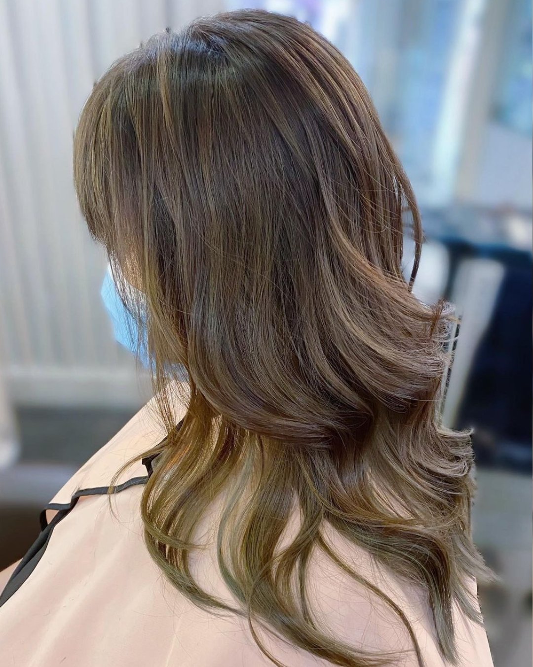 This layered cut by @kimagehairdressingschool pairs perfectly with a muted ash brown that’s both soft and luminous. The feathered ends and face-framing layers create a sense of volume and lightness that enhances the tone’s natural sheen.