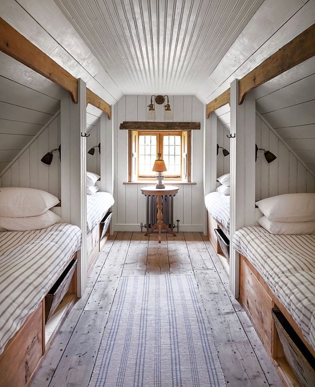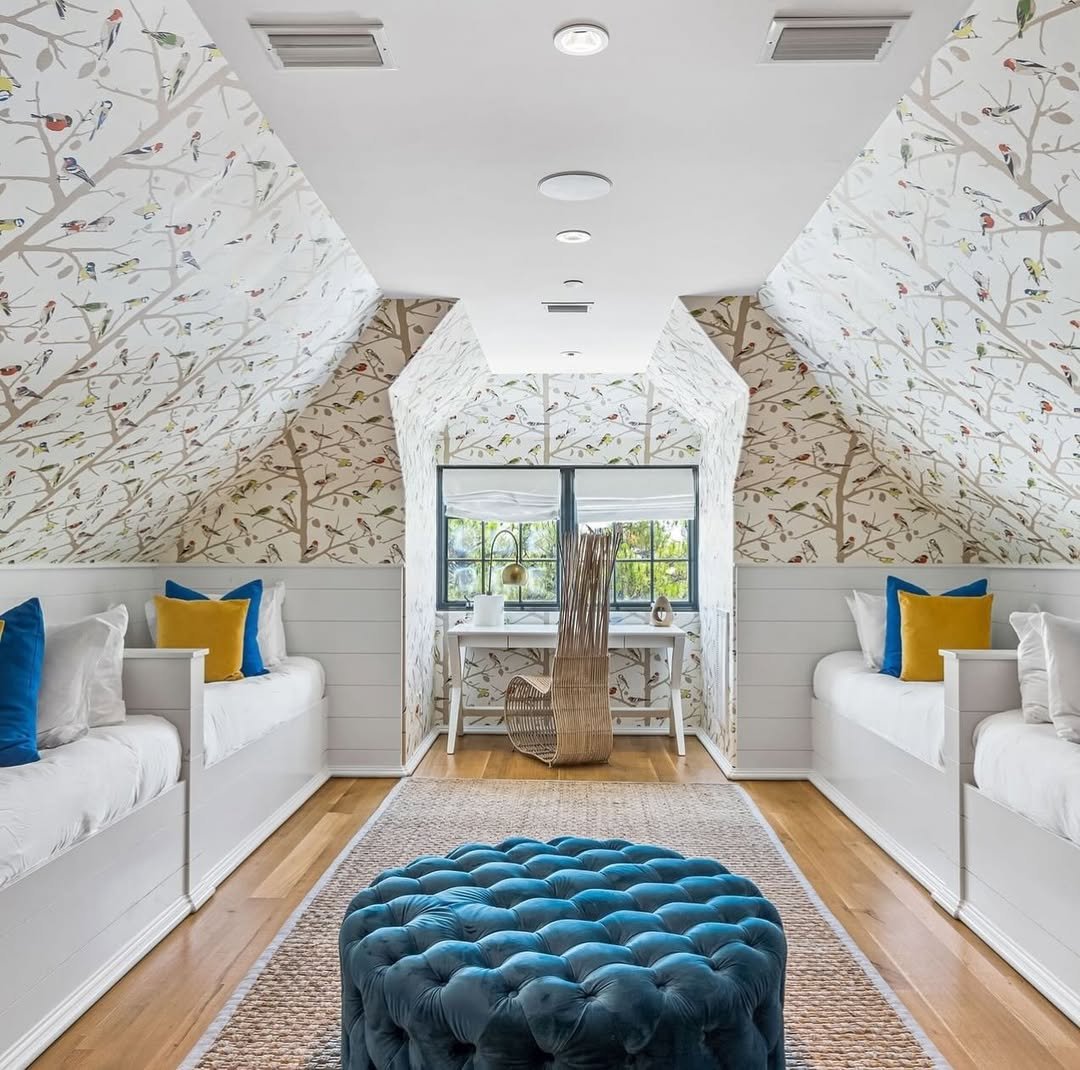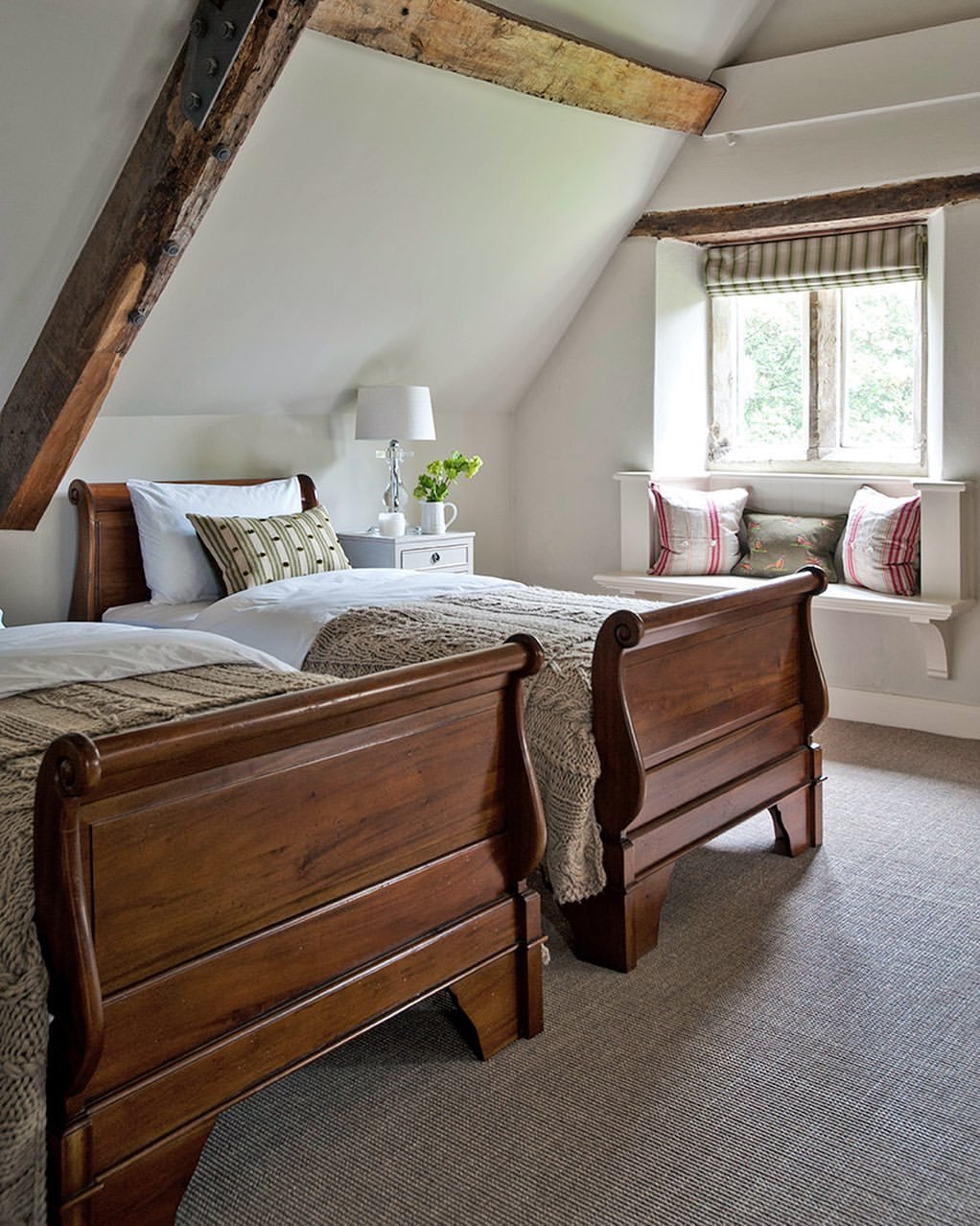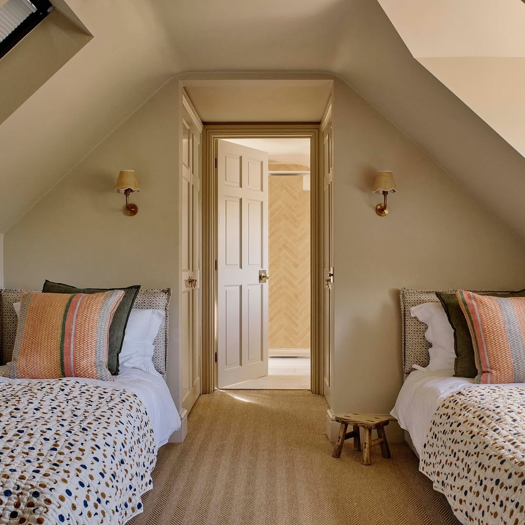 This one feels like it belongs in a charming English cottage. The matching beds, tucked beneath the sloped ceiling, create a perfect little moment of symmetry that feels both cozy and intentional.