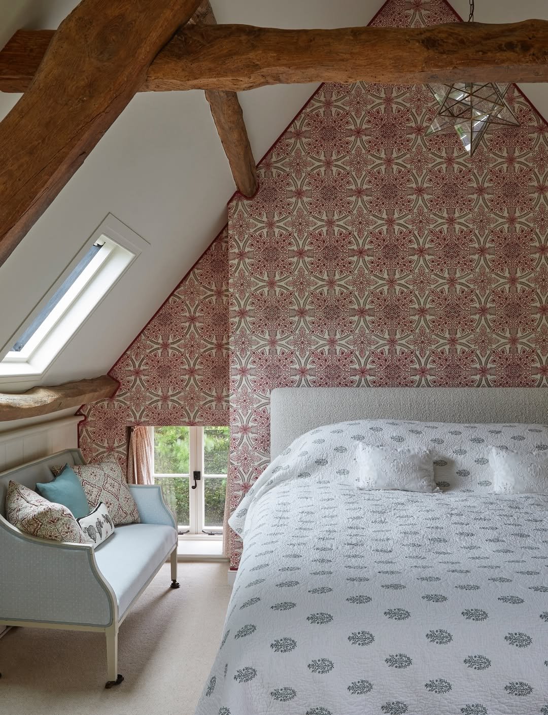 The wallpaper draws your eye upward, making the sloped ceiling feel like part of the design. It’s playful, but still feels considered.