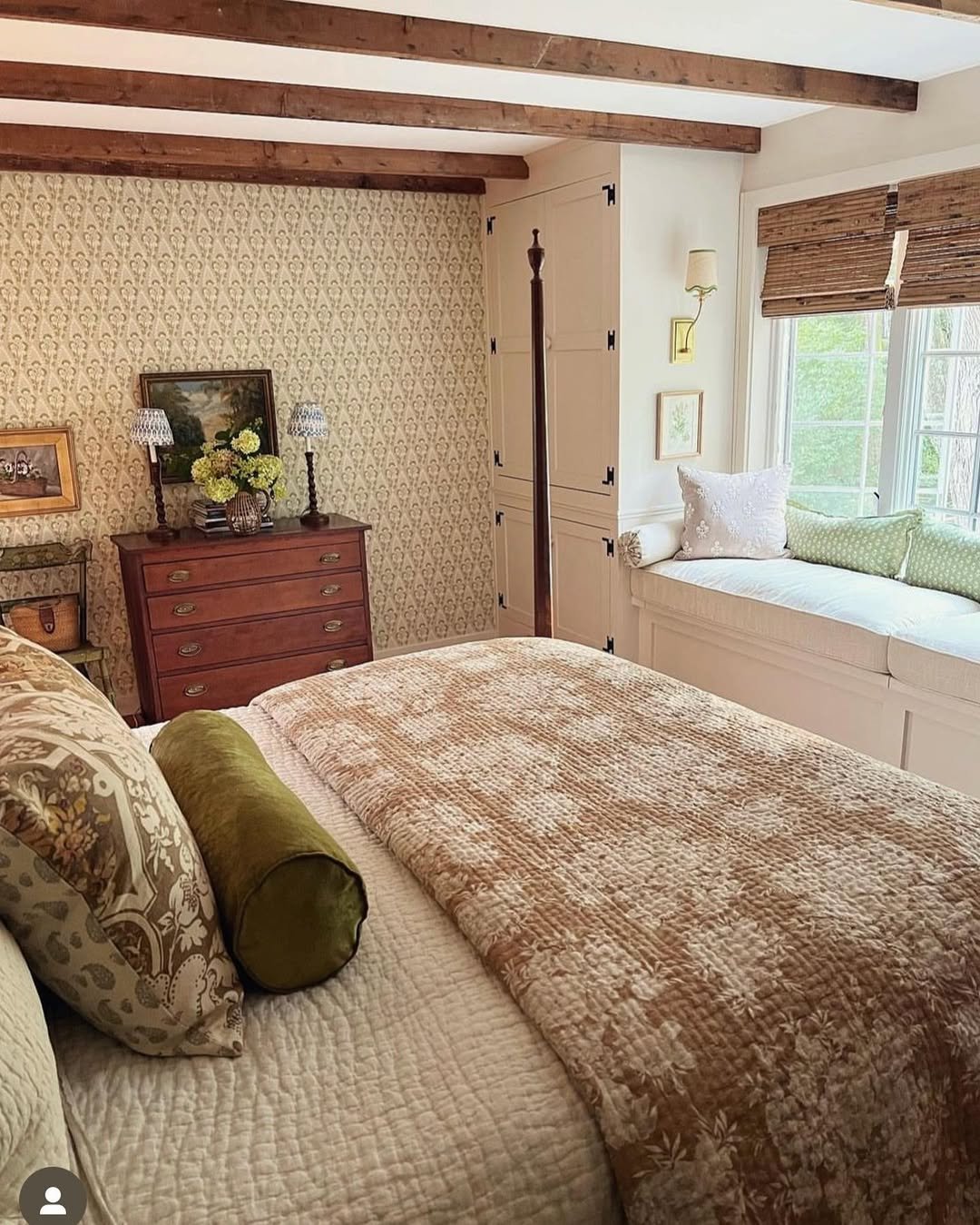 This space leans fully into that collected-over-time feeling. Warm woods, soft prints, and that built-in window seat create a rhythm that feels both practical and personal.