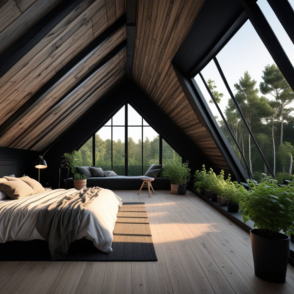 This attic opens up in the most unexpected way. Instead of feeling tucked in, the floor-to-ceiling glass pulls the outdoors right inside, turning the room into a quiet retreat surrounded by trees.