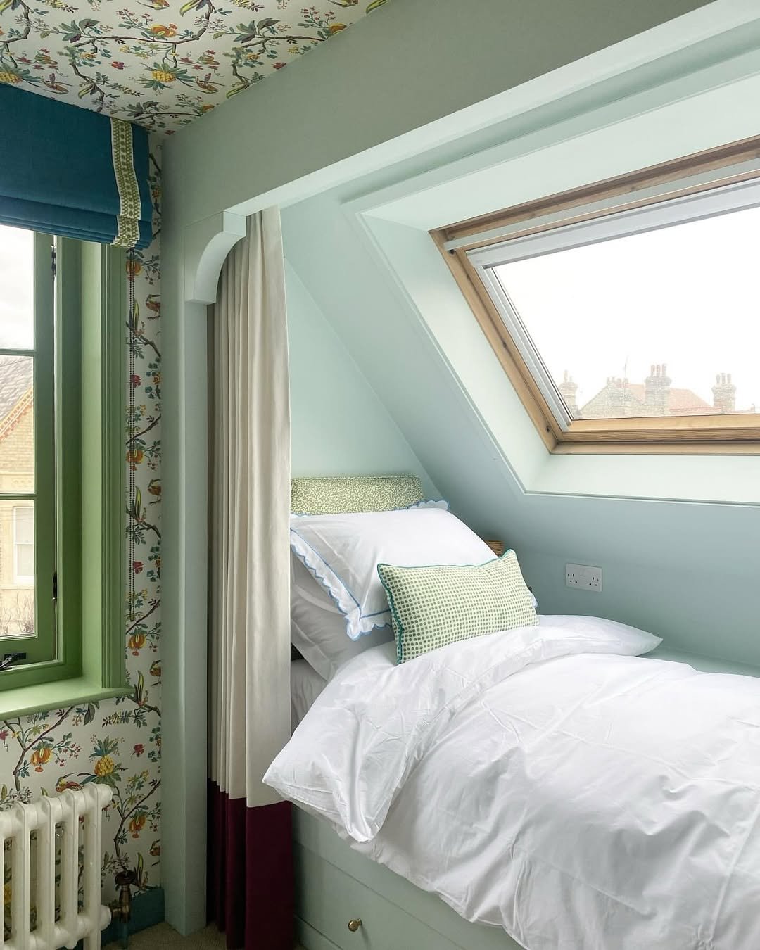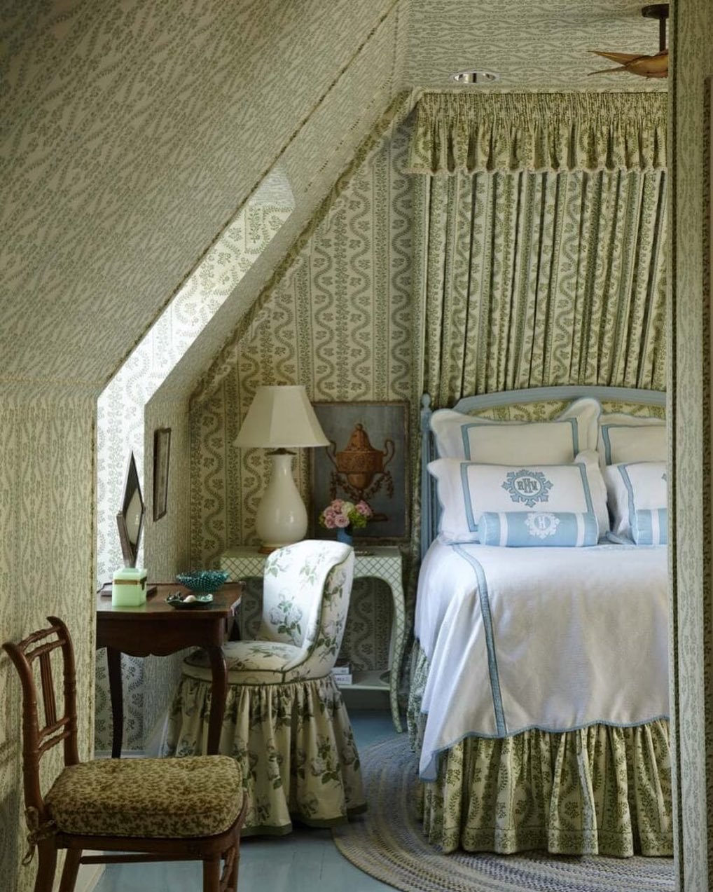Tucked beneath the eaves, this little bed feels almost hidden. The pale green walls and delicate patterns give it a fresh, airy feel without losing that sense of coziness.