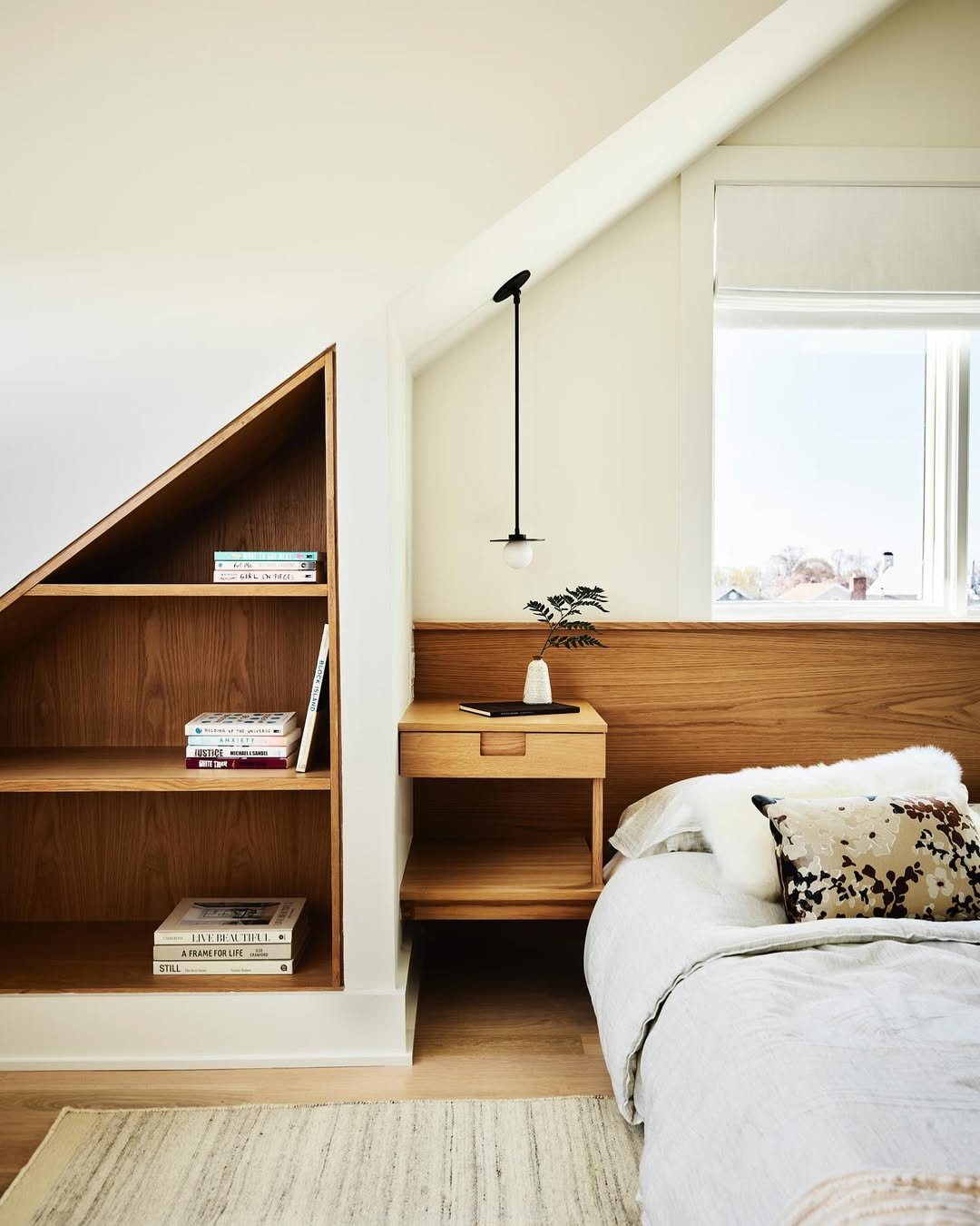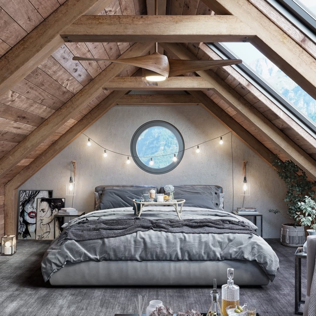 There’s something about a sloped ceiling wrapped in warm wood that instantly softens a room. Here, the angled lines feel intentional, almost cocooning, while the sunlight pouring through that triangular window brings everything to life.