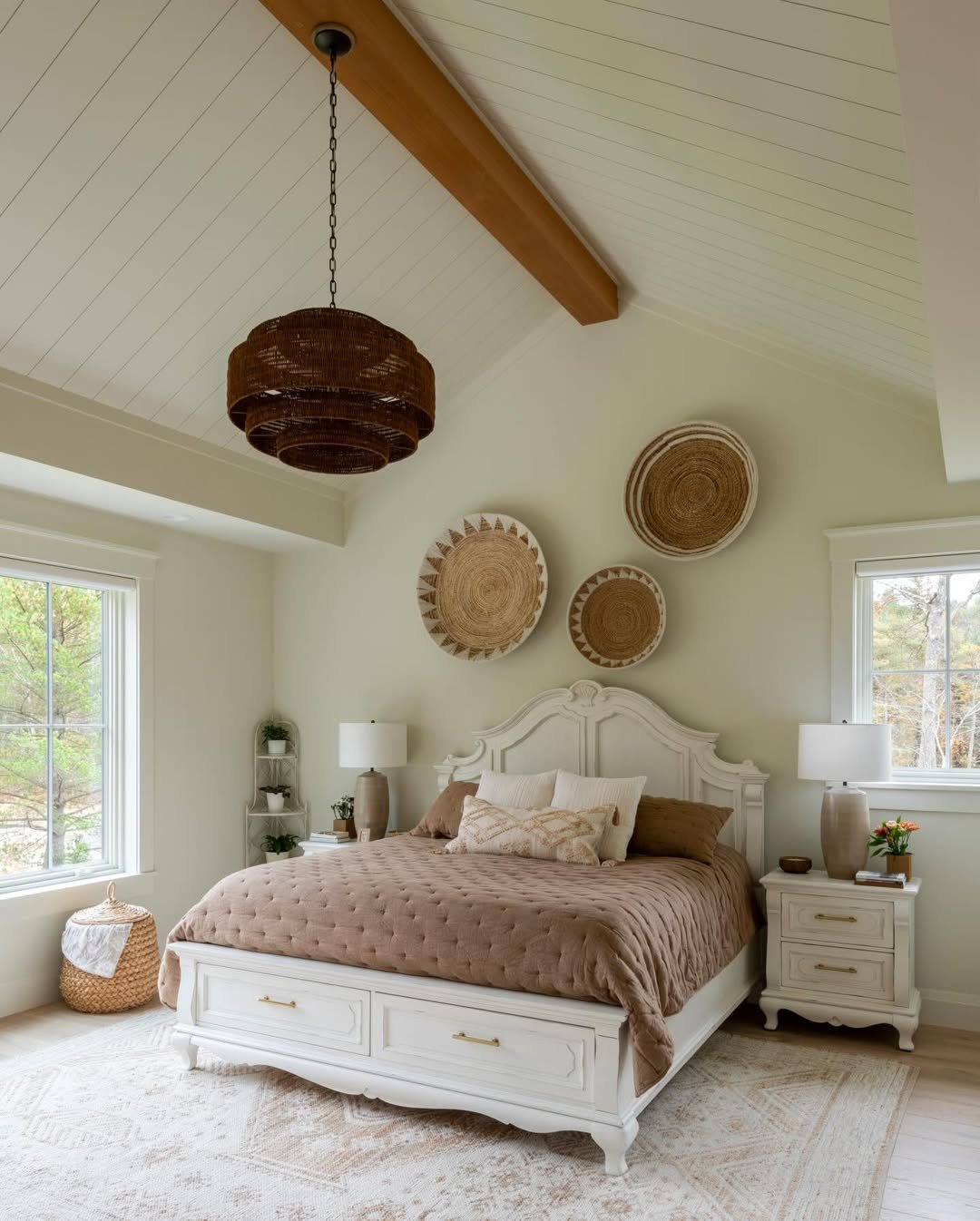 There’s a quiet softness to this attic that feels instantly calming. The creamy palette, layered with warm taupe bedding and woven wall pieces, gives the room a grounded, almost spa-like feel without losing that cozy attic charm.