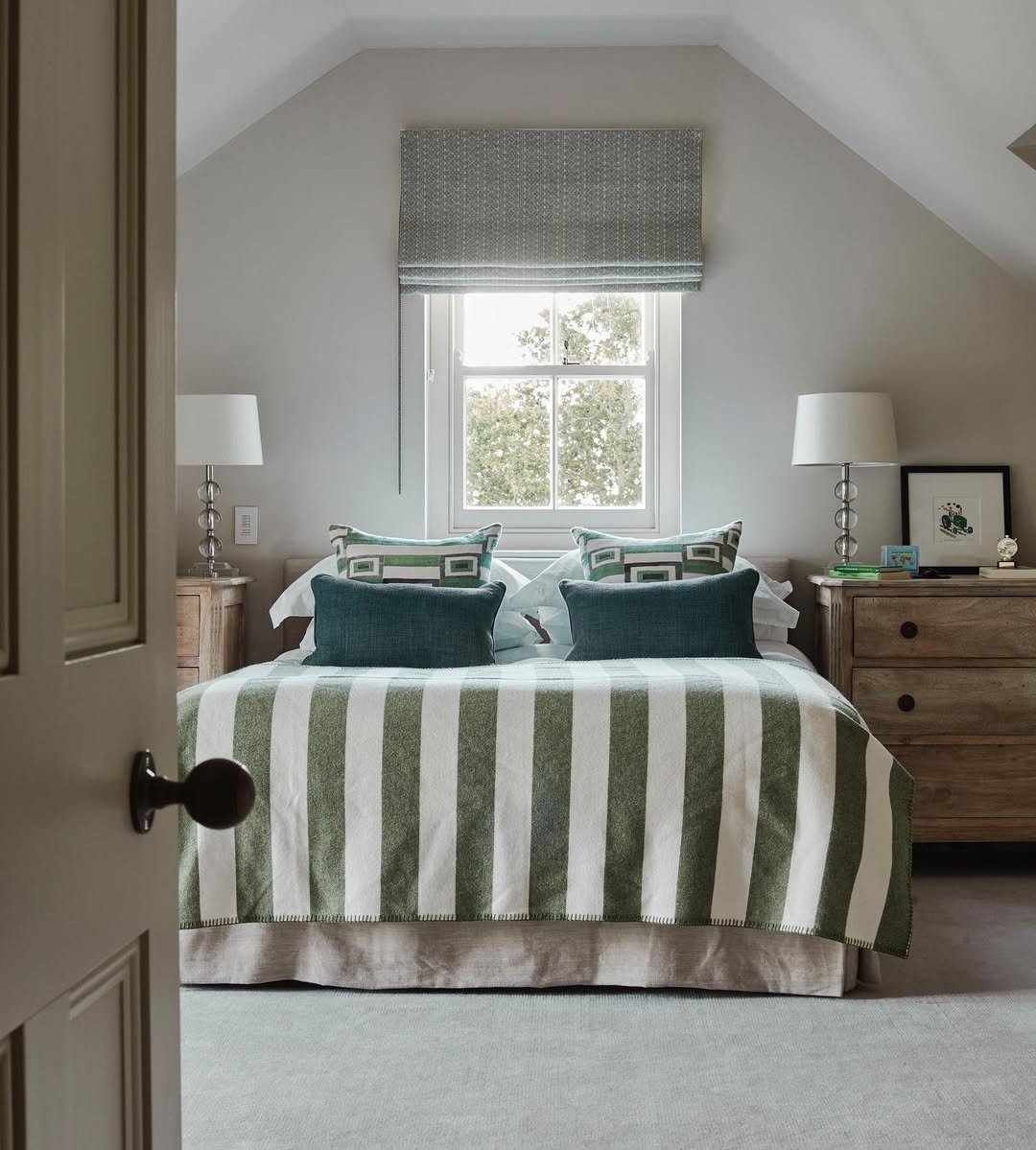 This one feels crisp in the most understated way. The tailored bed, framed by soft neutrals, gets just enough energy from those green stripes and layered cushions to keep things from fading into the background.