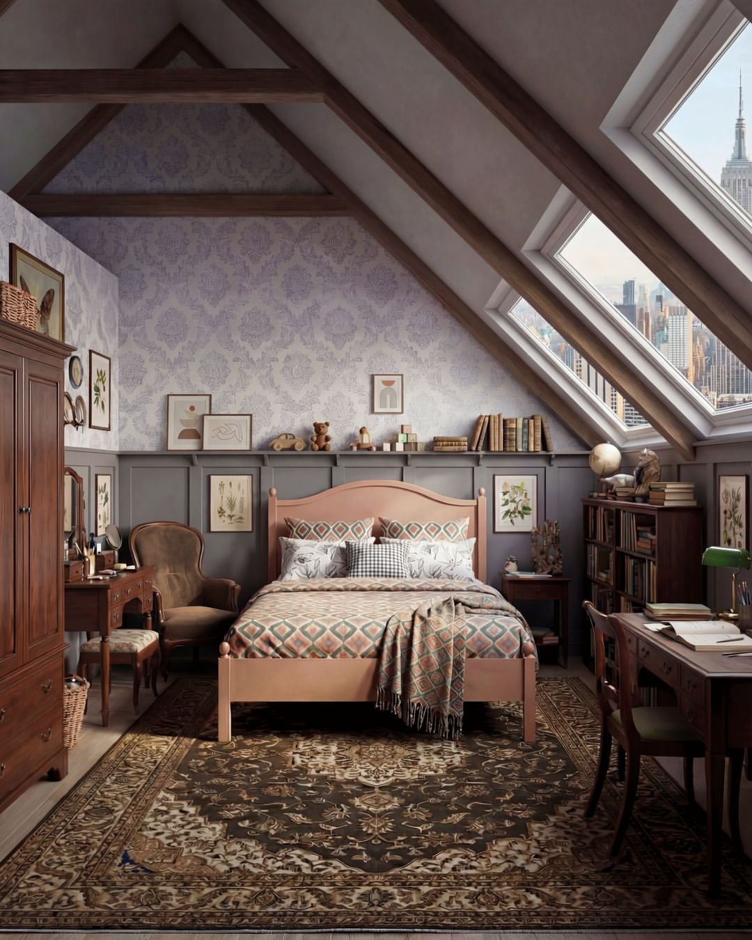This room doesn’t hold back on charm. The floral wallpaper wraps around the sloped ceiling, turning the entire attic into a soft, patterned envelope.