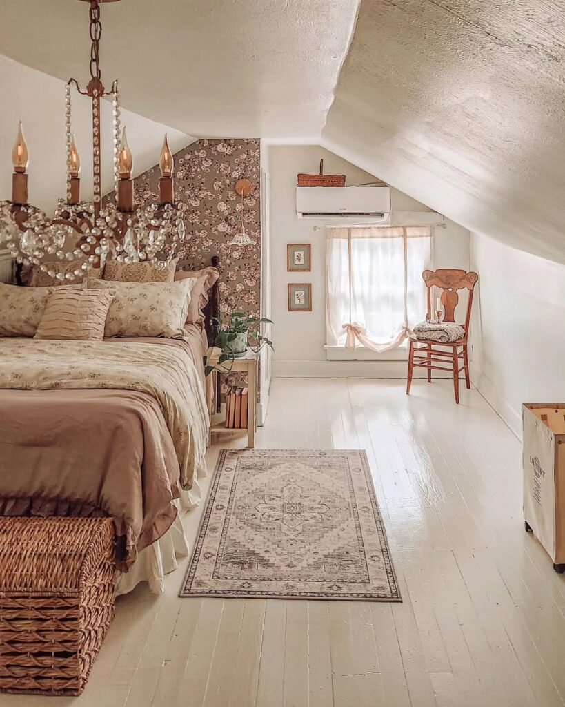 This room doesn’t hold back on charm. The floral wallpaper wraps around the sloped ceiling, turning the entire attic into a soft, patterned envelope.