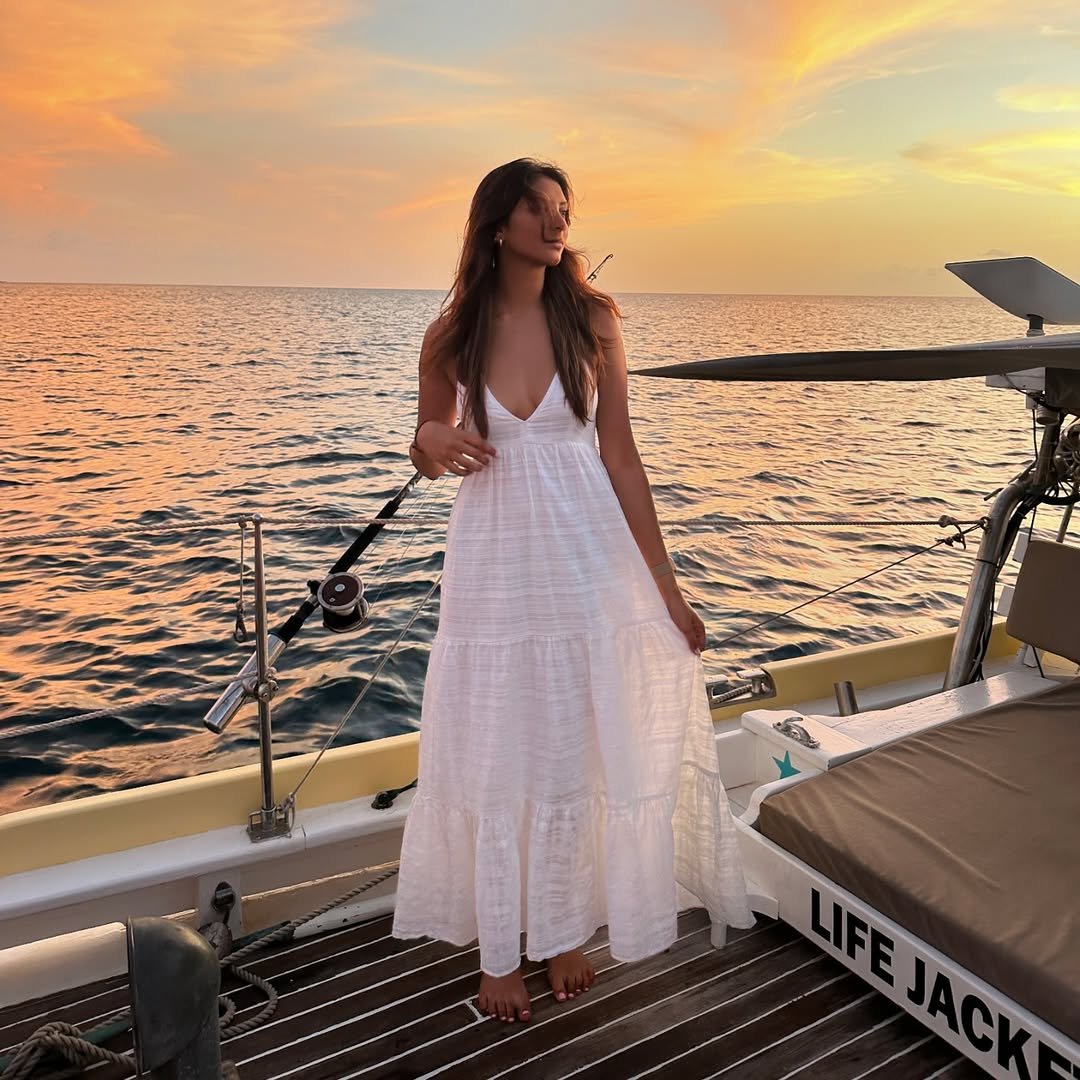 A soft white sundress catching the last light on open water, it moves with the breeze in that effortless, almost weightless way. The deep neckline and tiered skirt feel relaxed but still intentional, perfect for slow sunsets and salt-kissed air.
