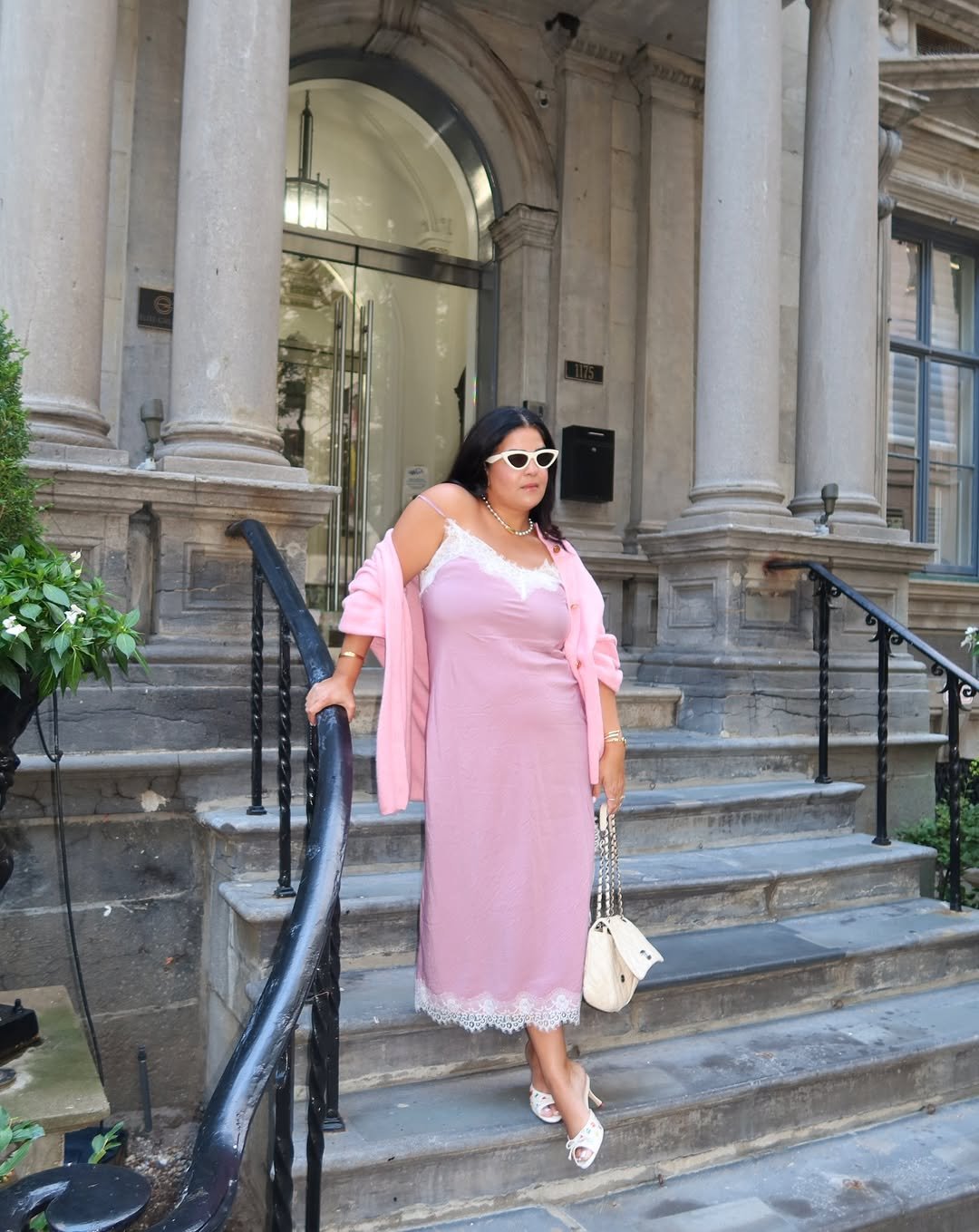 A soft pink slip with lace trim layered under a matching cardigan feels quietly polished on classic stone steps. The tonal styling with white heels and a structured bag leans into that refined, city-girl elegance.