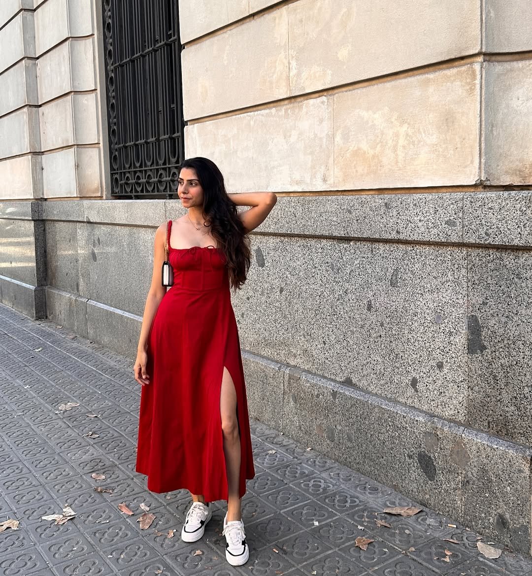 A vibrant red dress with a high slit paired with sneakers feels fresh and unfussy. The structured bodice adds shape, while the casual shoes bring it back down to earth.