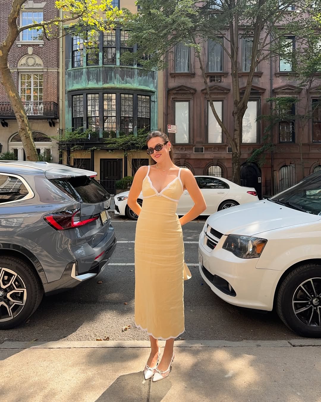 A soft yellow midi with delicate straps feels like sunshine translated into fabric. Styled with simple heels and dark sunglasses, it lands right between polished and easy.
