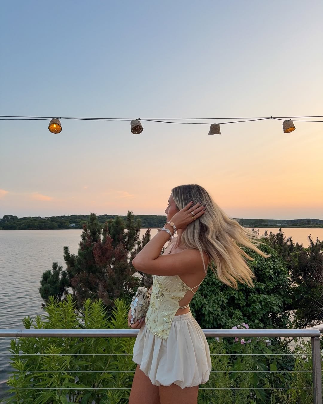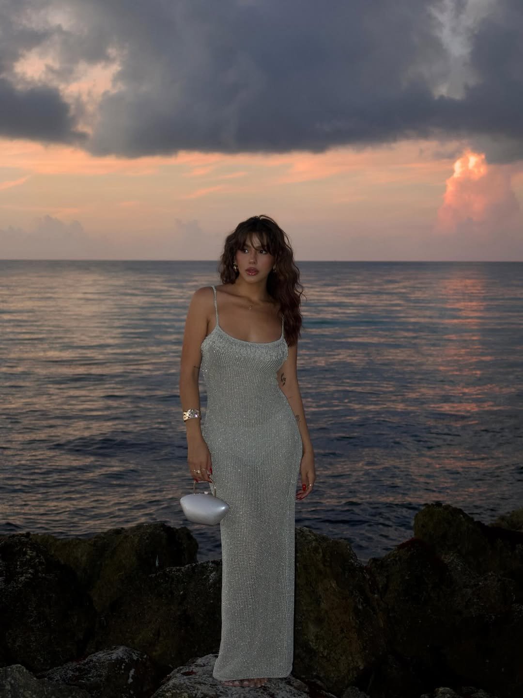 A liquid silver slip dress against a moody sunset feels like pure August magic. The way the fabric catches the last light, paired with a sleek mini bag and soft waves, turns a simple silhouette into something cinematic.