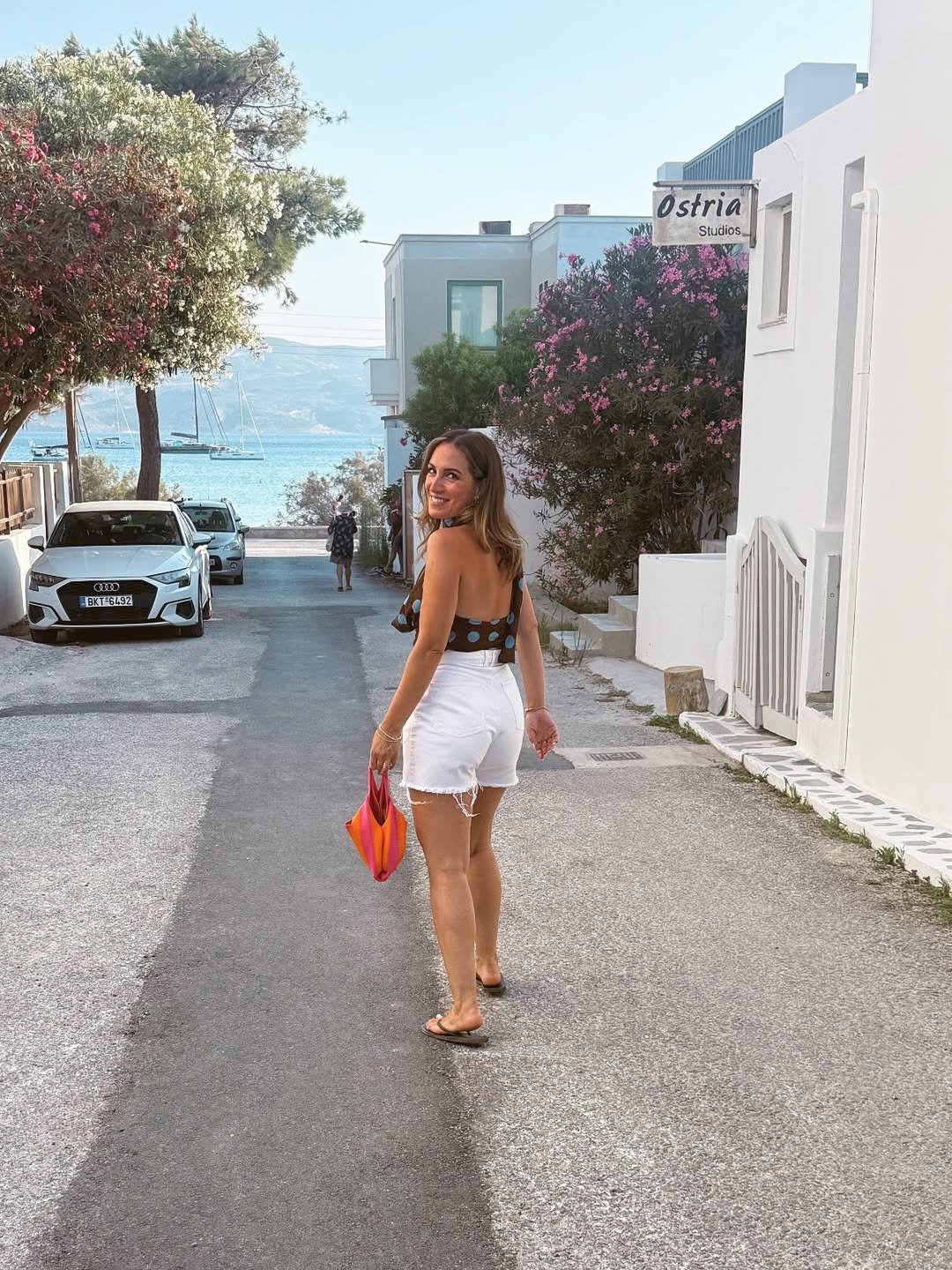A polka dot halter paired with crisp white shorts brings a playful charm to a breezy coastal street. The pop of color from the bag adds just enough contrast against the soft, seaside palette.