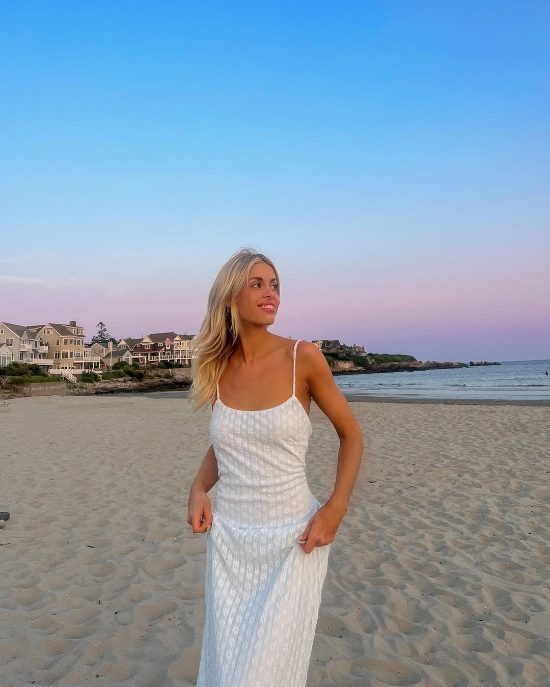 A delicate white slip dress against a pastel sky and quiet shoreline feels timeless in the best way. The subtle texture catches the light just enough, while the slim straps keep everything soft and understated.