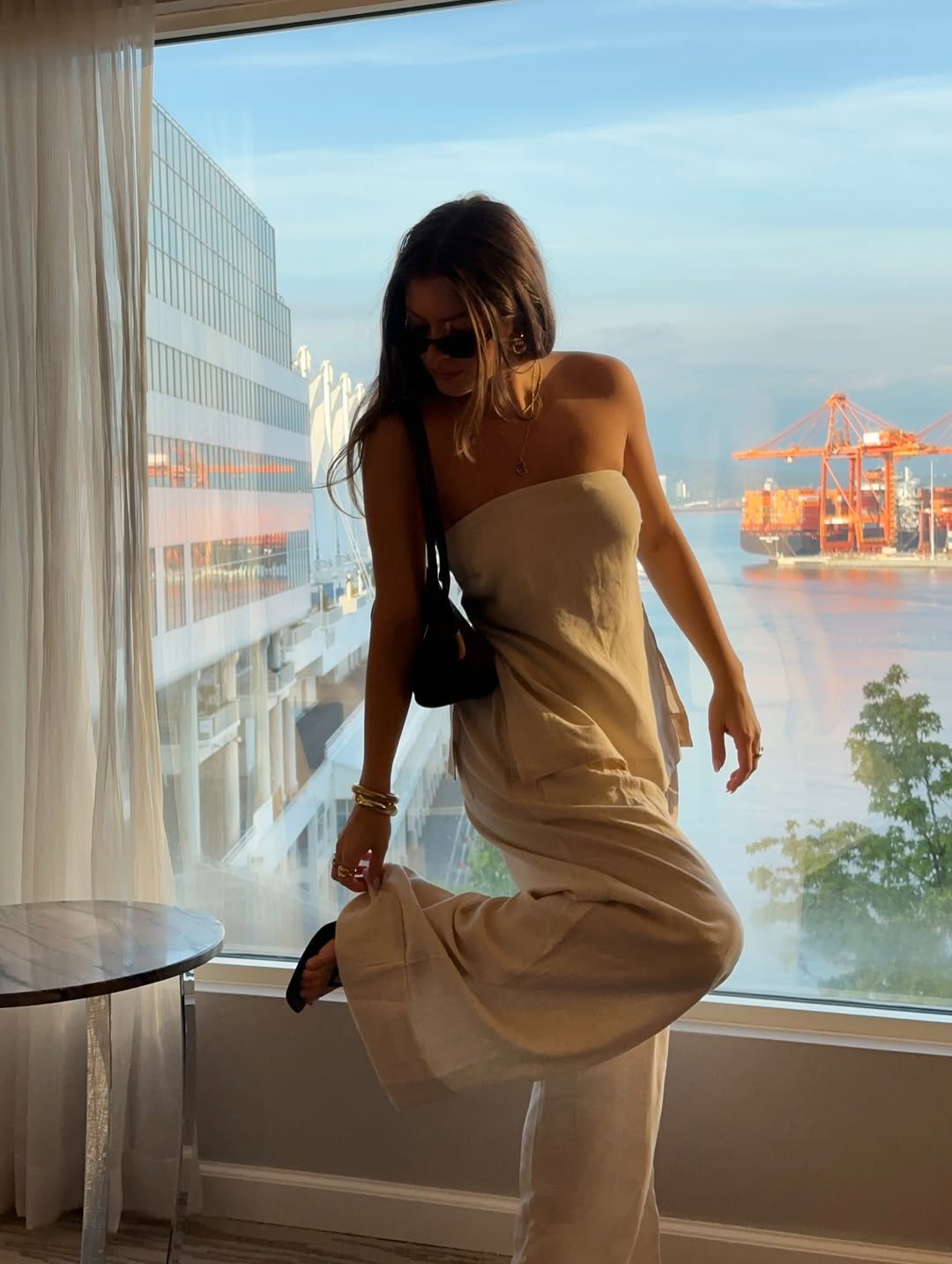 A strapless linen set in warm beige tones, framed by a floor-to-ceiling window, feels like calm captured in motion. The relaxed drape of the fabric pairs beautifully with the soft glow reflecting off the water outside.