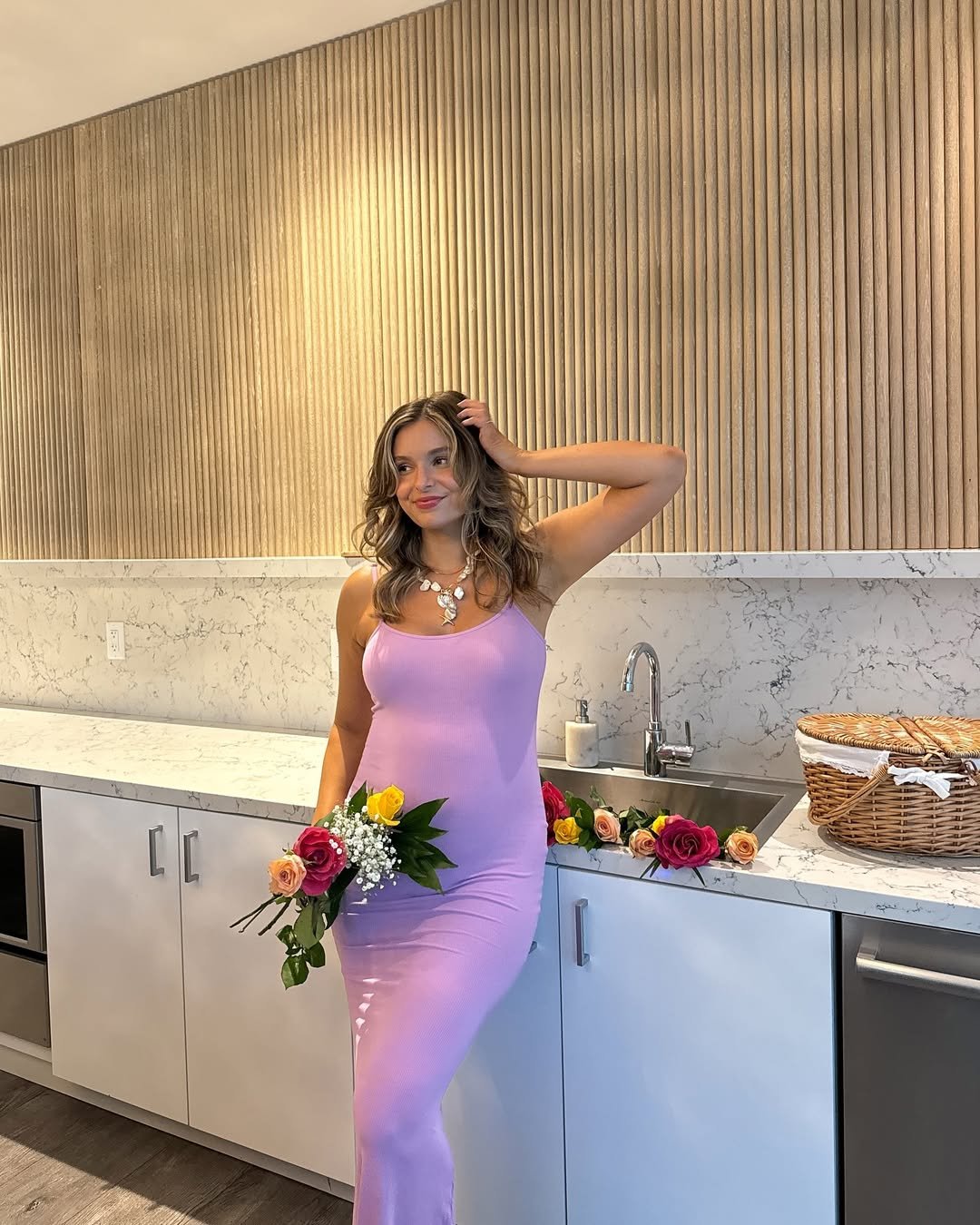 A lilac bodycon in a bright, minimal kitchen feels playful and fresh, like summer brought indoors. The fitted shape balances the softness of the color, while the bouquet adds that spontaneous, just-picked charm.