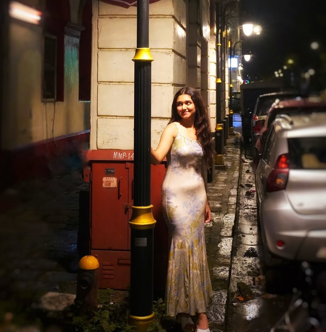 A soft, printed slip dress under glowing streetlights brings out a quiet kind of drama. The fabric catches the light just enough, creating movement with every step against the glossy pavement.