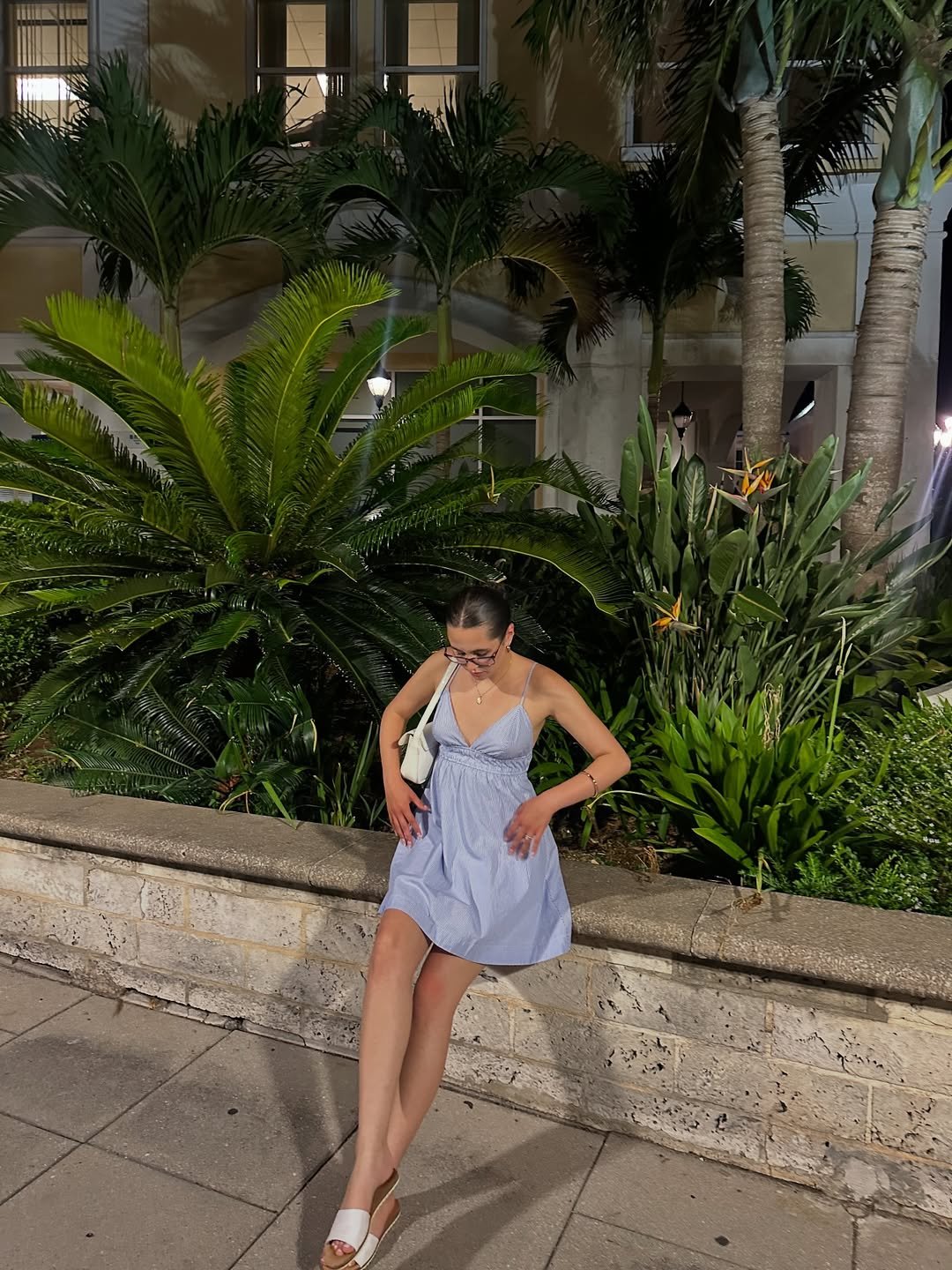 A light blue mini dress under soft evening lighting, surrounded by lush greenery, feels fresh and understated. The airy fabric and simple silhouette make it easy to wear, but still visually striking.