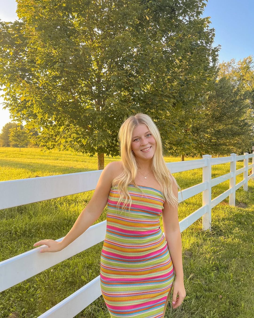 A fitted rainbow knit dress brings that carefree, late-August energy when summer feels a little more playful again. The strapless cut keeps it clean, letting the color do all the work without overwhelming.