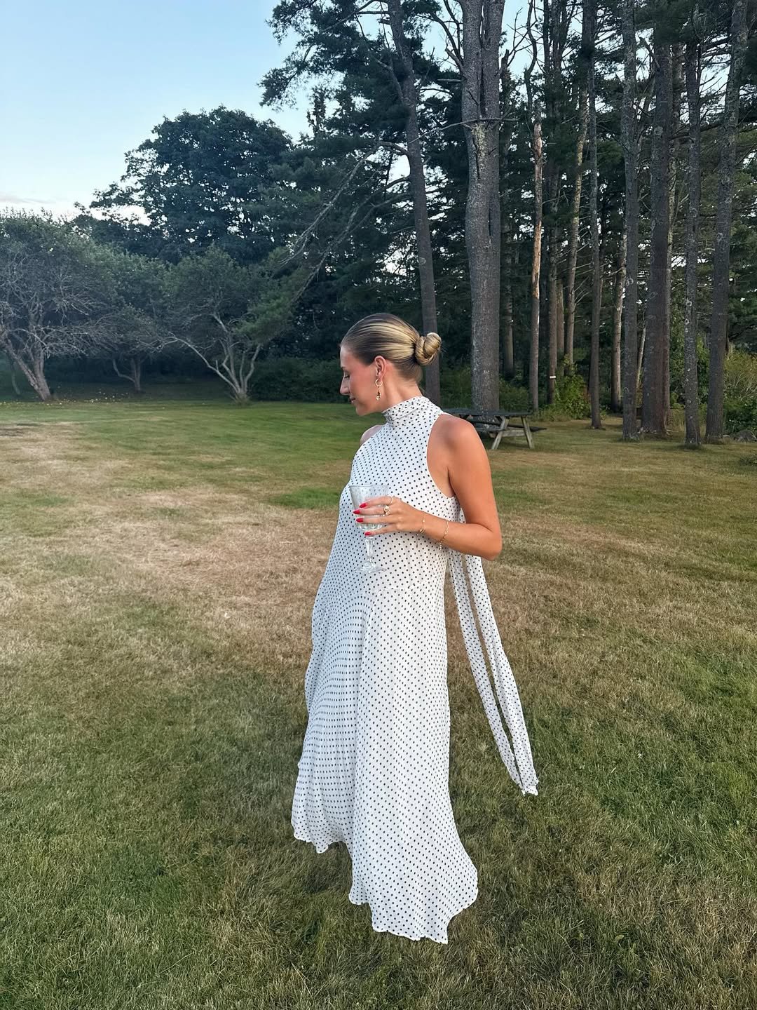 A high-neck polka dot midi with a flowing silhouette feels like a nod to vintage summer dressing, but cleaner and more current. The soft movement of the fabric paired with a sleek bun gives it that refined, just-stepped-outside energy.