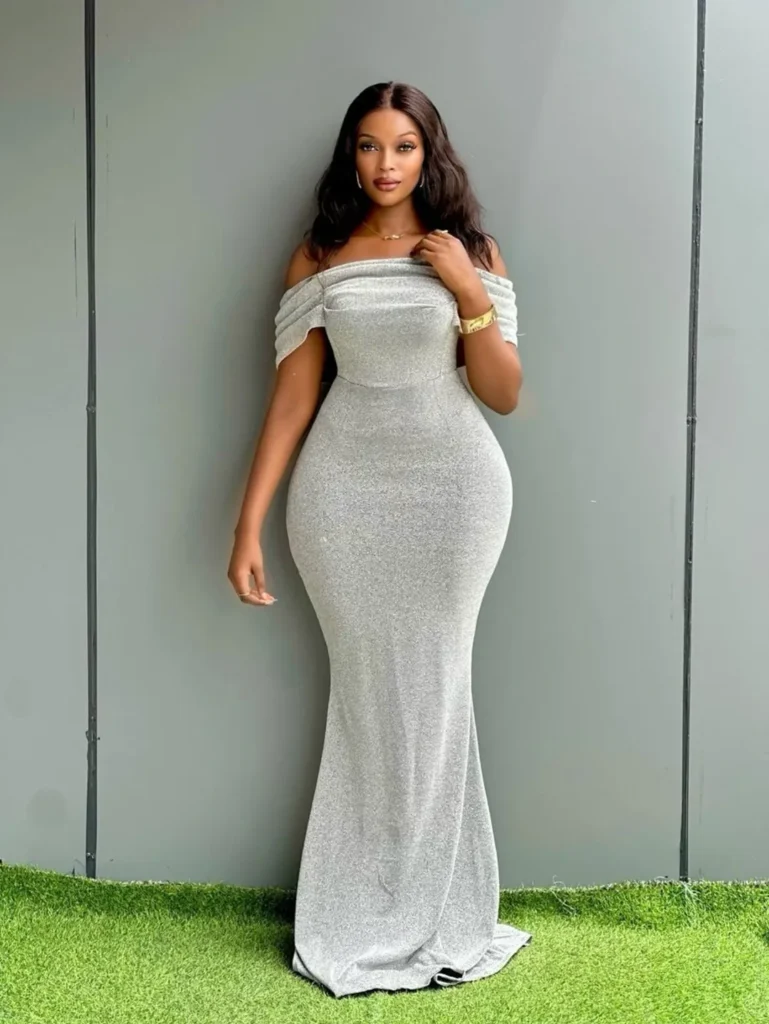 A structured silver gown with an off-shoulder neckline brings a sense of drama that still feels clean and refined. The fitted shape highlights every curve while keeping the overall look polished.