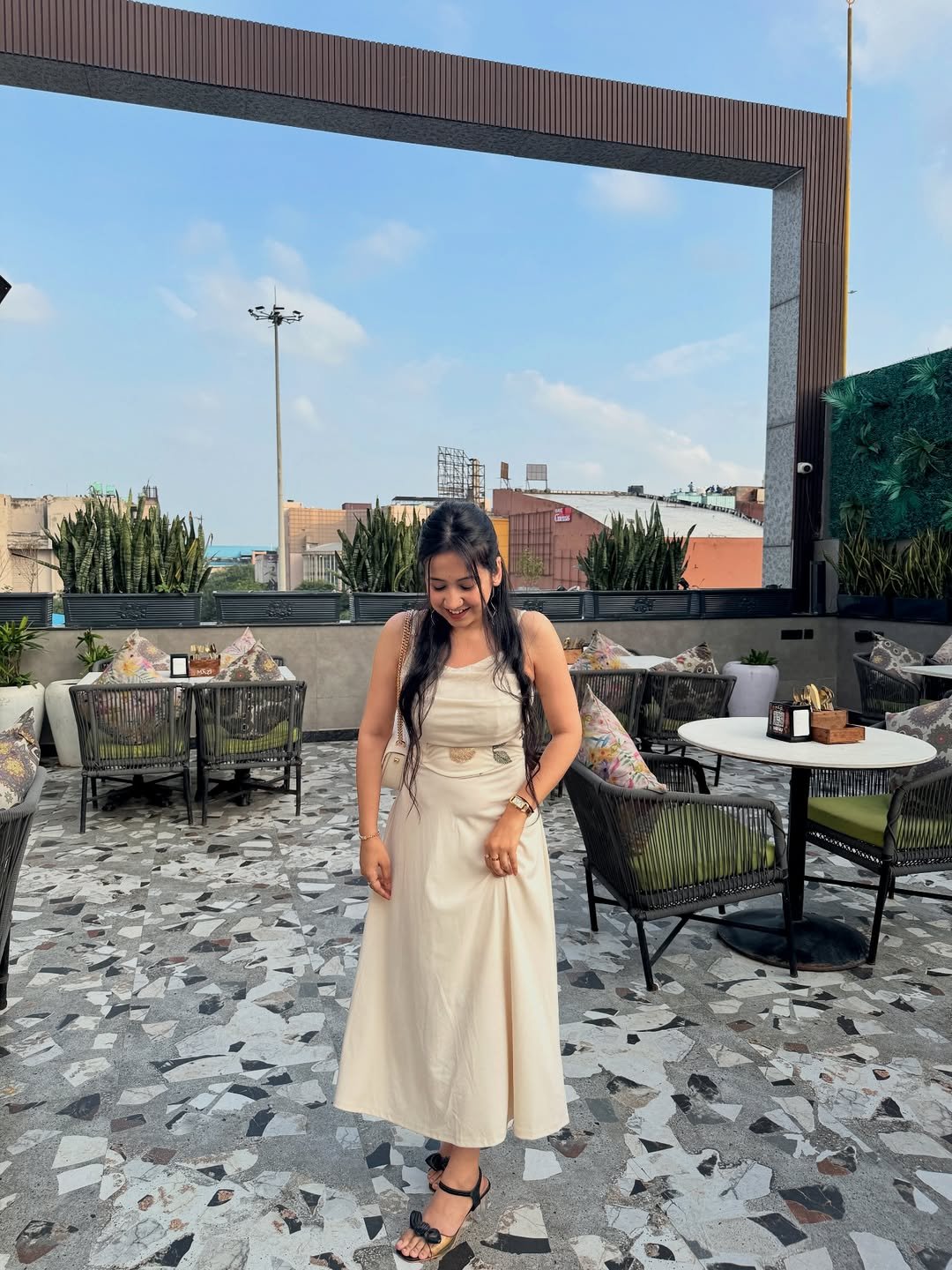 A cream midi with subtle detailing feels calm and refined against a breezy rooftop setting. The flow of the skirt and minimal sandals create a look that’s both relaxed and quietly elevated.