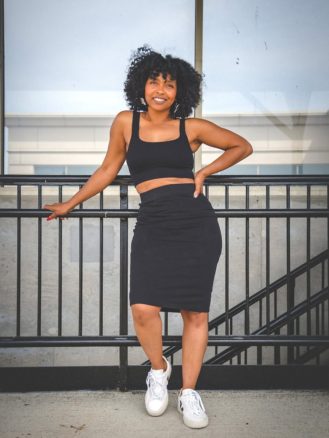 A black crop top and fitted skirt with crisp white sneakers brings a fresh, city-ready edge. The silhouette is simple, but the contrast between sporty and sleek makes it feel intentional.