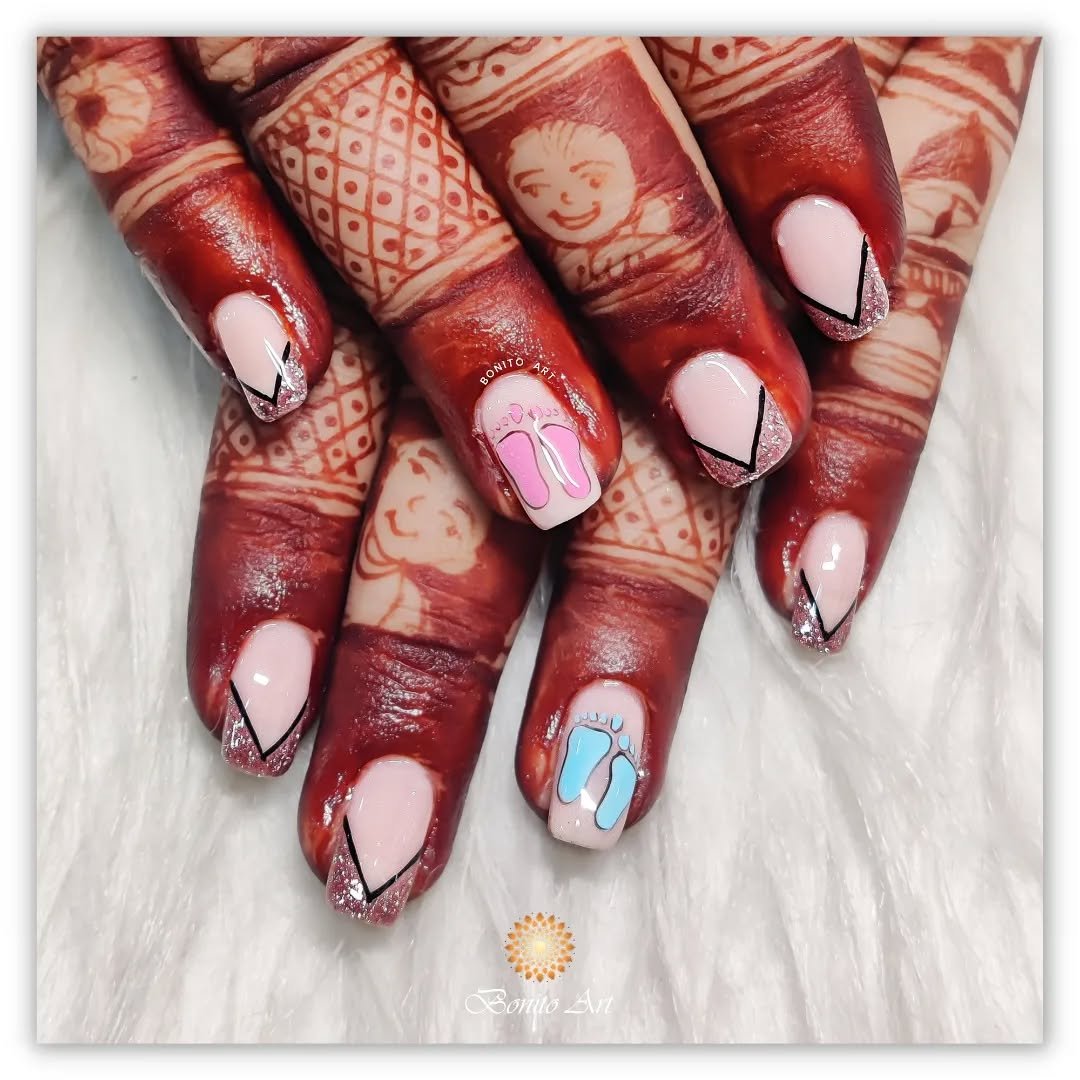 This joyful set leans fully into the gender-reveal moment — glitter, little footprints, soft pinks and blues, and even “MOM TO BE” written proudly across a nail. It’s festive, fun, and impossible not to smile at.