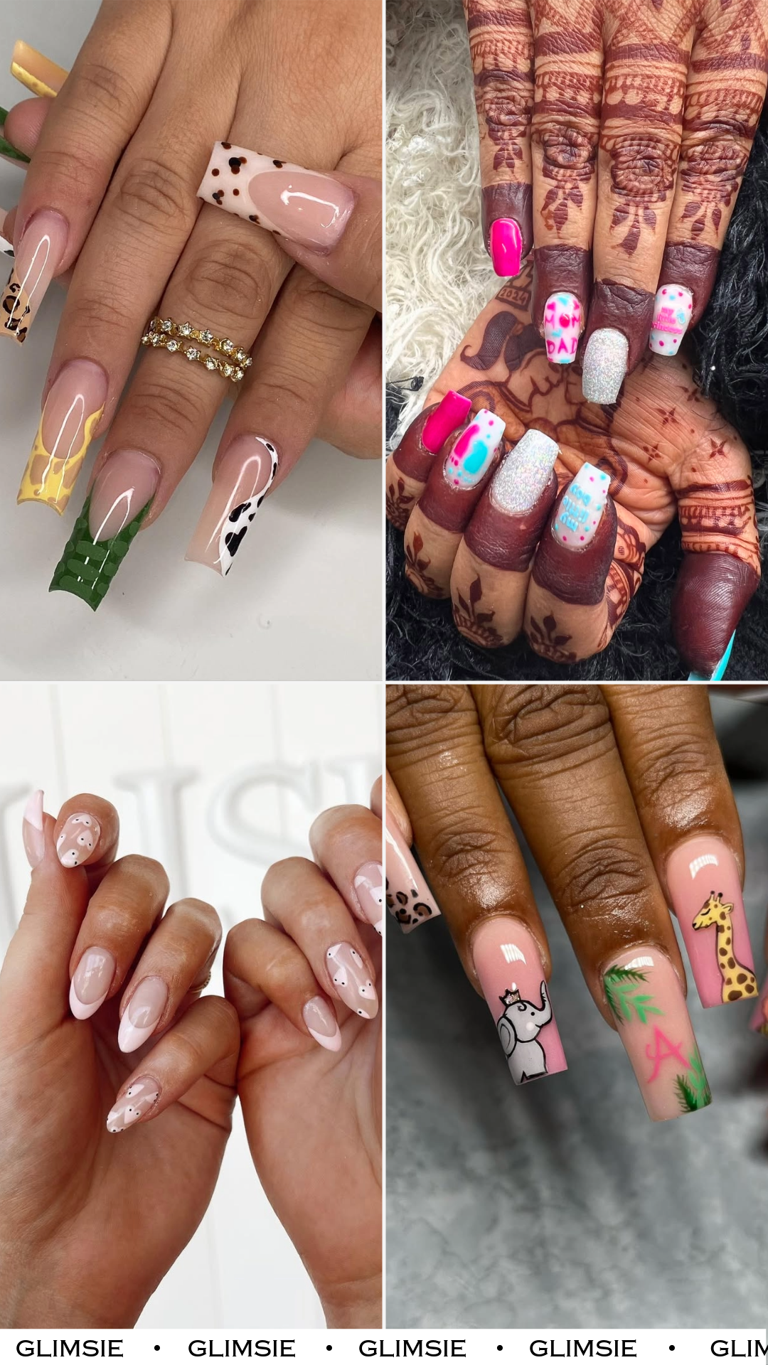 If you love a statement, these safari-inspired tips bring playful energy to the baby-shower moment. Giraffe yellow, crocodile green, and cow-print swirls turn each nail into a tiny adventure — bold, fun, and full of personality.