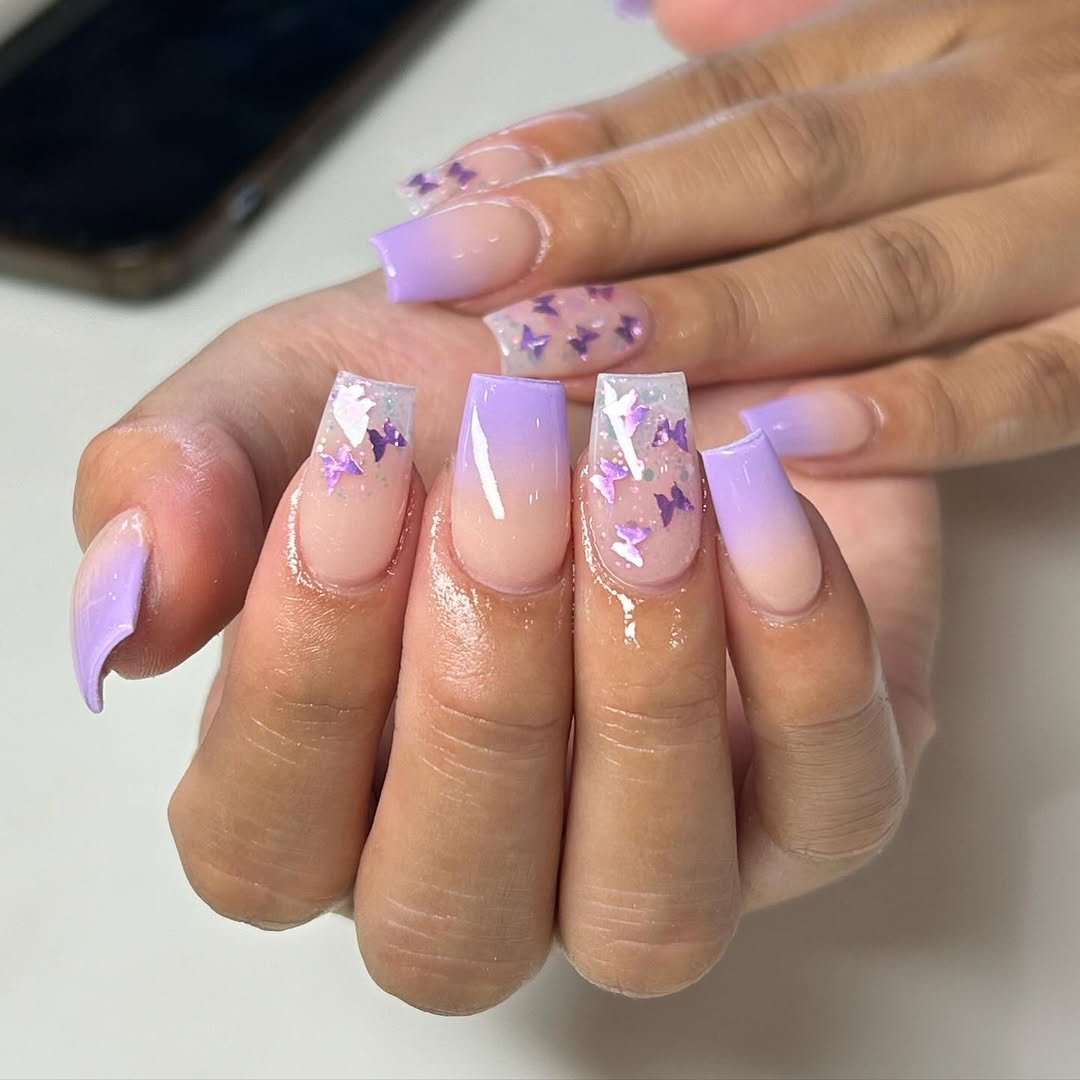 Light lavender melts into sheer nude with sparkling butterfly confetti sprinkled across the tips. It’s whimsical, floaty, and almost ethereal — like tiny wings fluttering in celebration of a new little life.