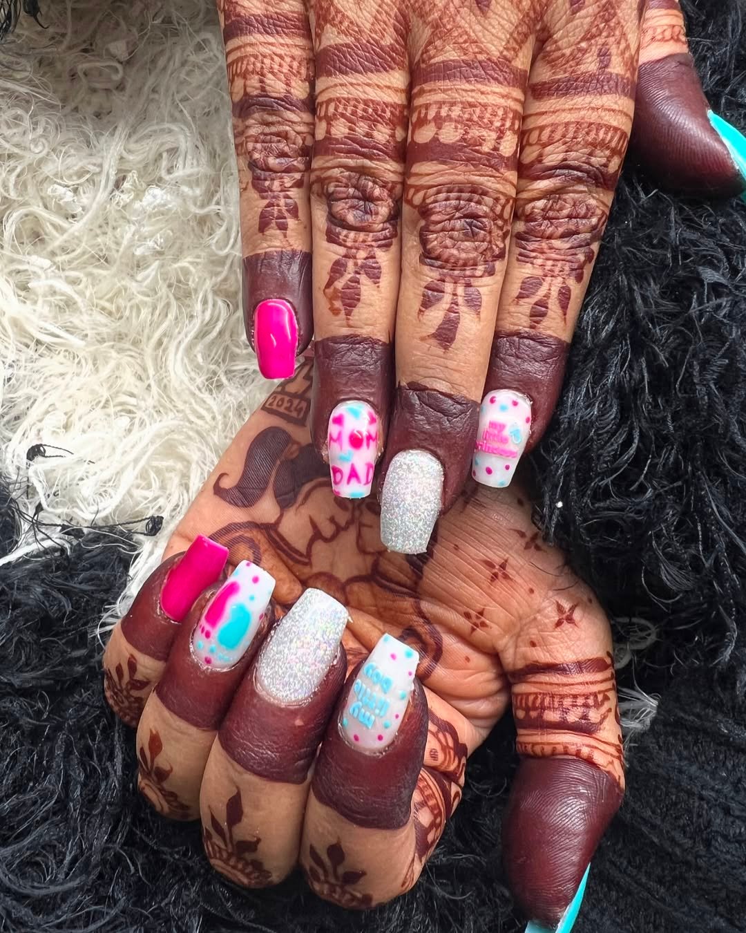 Bright pops of pink, silver glitter, little messages like “MOM” and “DAD” — this set radiates joy. The mix of soft baby colors with chunky shimmer makes every nail feel like its own tiny celebration.