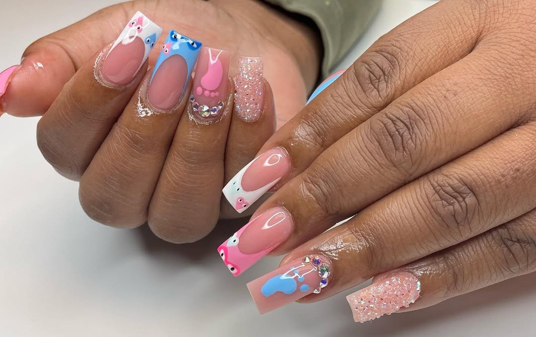 Glossy French tips with drippy baby-blue art, soft pink accents, and sparkly crystals — this is baby-shower glam at its most playful. Each nail carries a little nod to boy-or-girl suspense, but with a polished, salon-sleek finish.