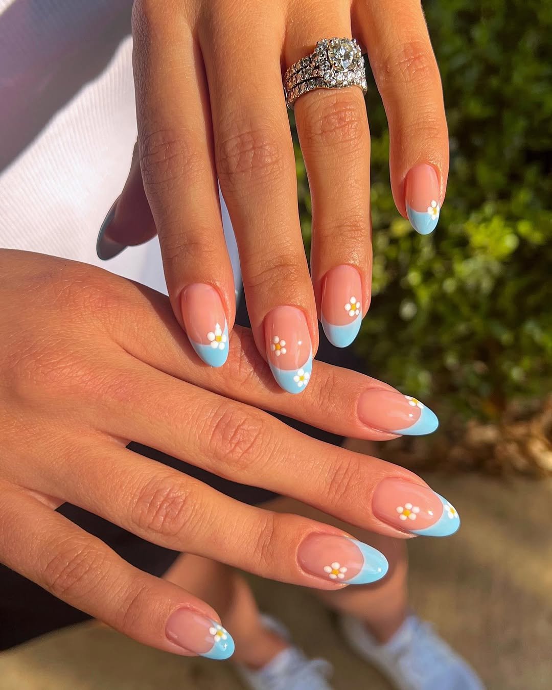 There’s something so tender about baby-blue French tips paired with tiny daisy blooms — it feels like sunshine on a slow spring morning. The soft nude base keeps everything clean and airy, while the floral accents whisper “sweet little arrival” without trying too hard.