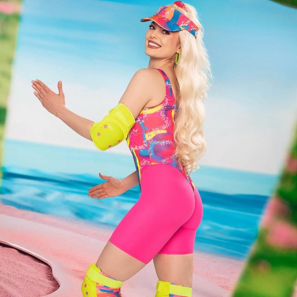 Bright, bold, and totally ready for Venice Beach, this look leans into Barbie’s rollerblading era with wild neons and a splashy visor. From the hot pink bike shorts to the arm pads, it’s campy in the most perfect way.