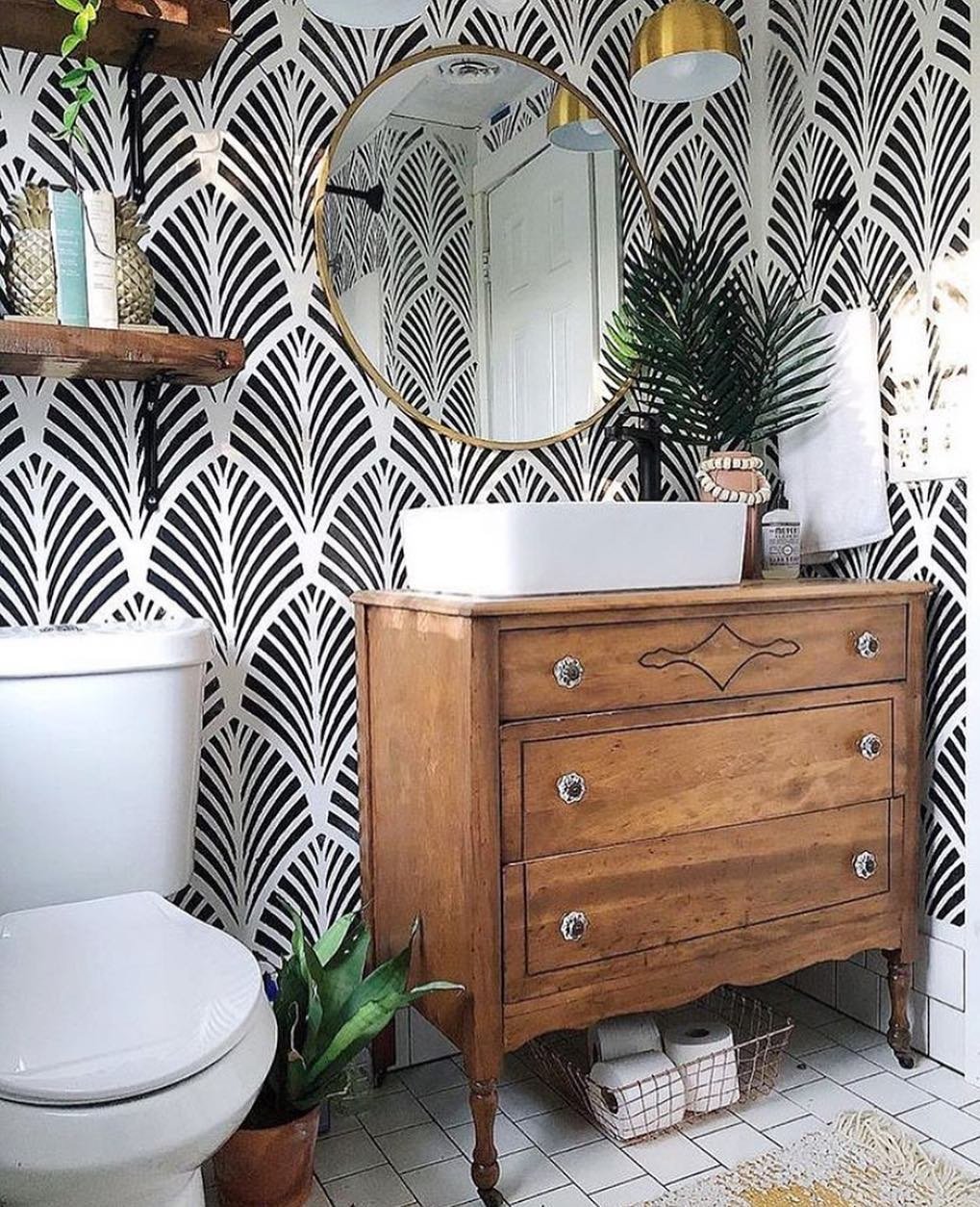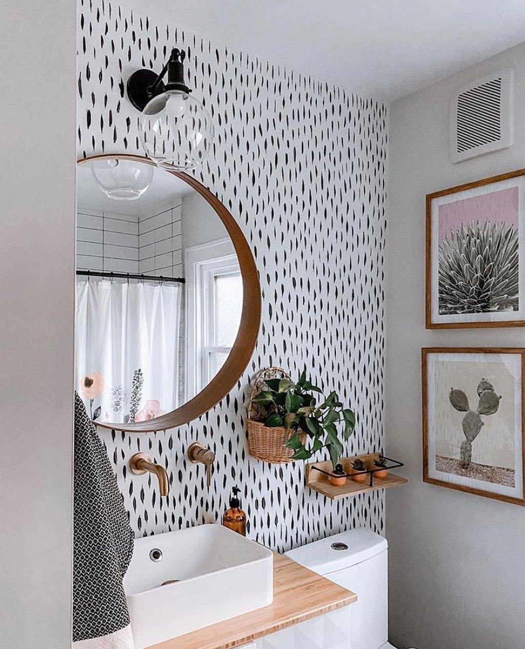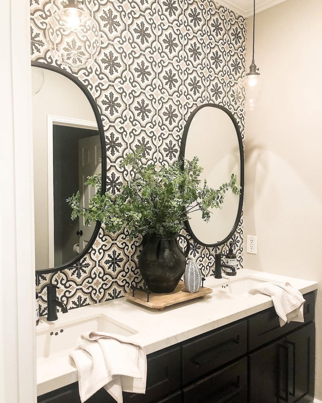 But the natural wood vanity keeps it grounded, so it doesn’t feel too loud. It’s confident, a little dramatic, and full of personality—just the way a great accent wall should be.