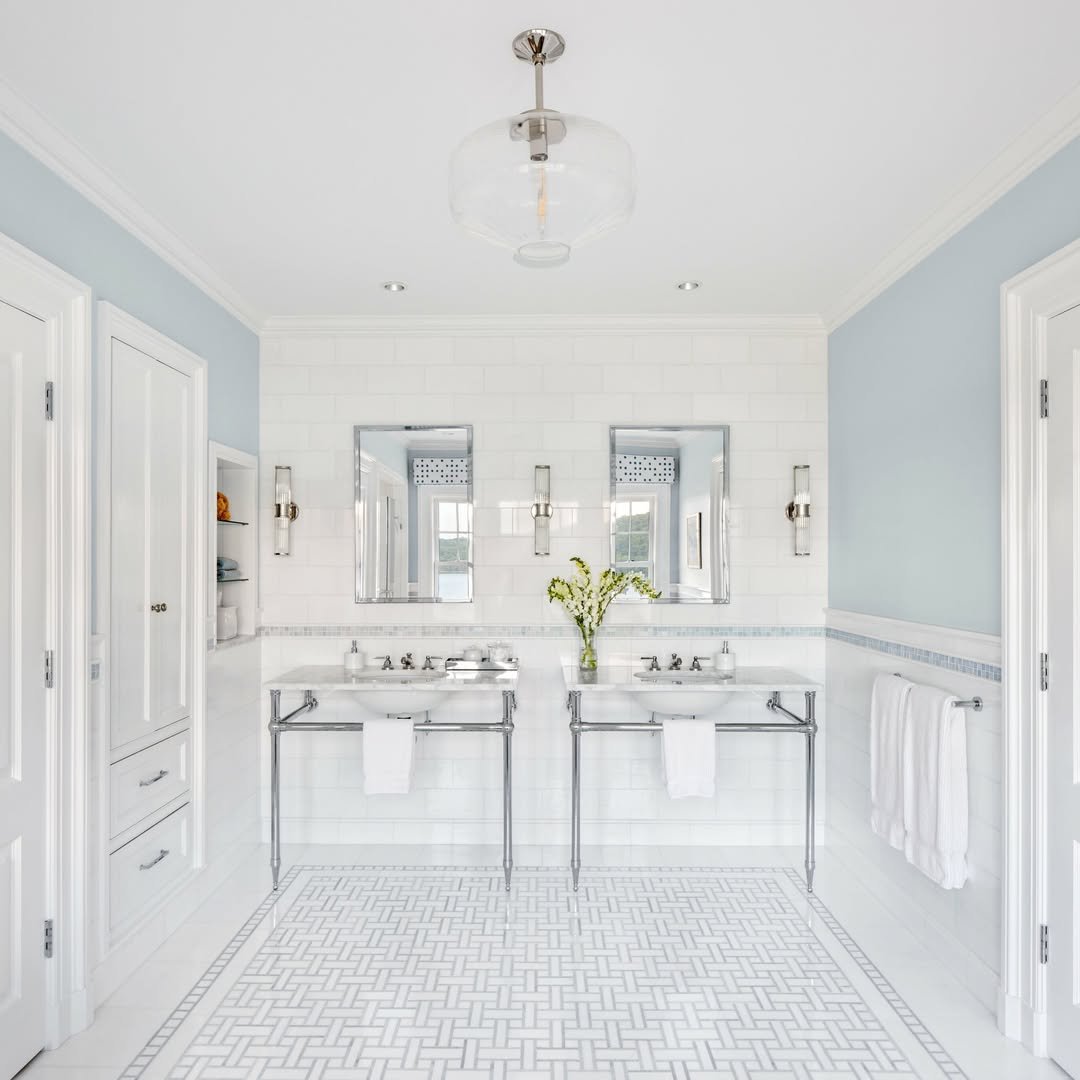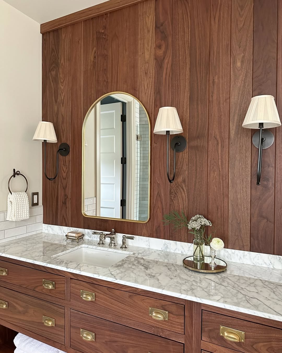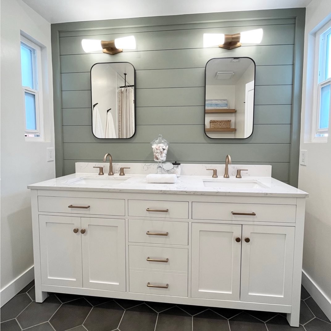 It’s polished, a little traditional, but still airy and modern. The symmetry with the double sinks just ties everything together like it was always meant to be this way.