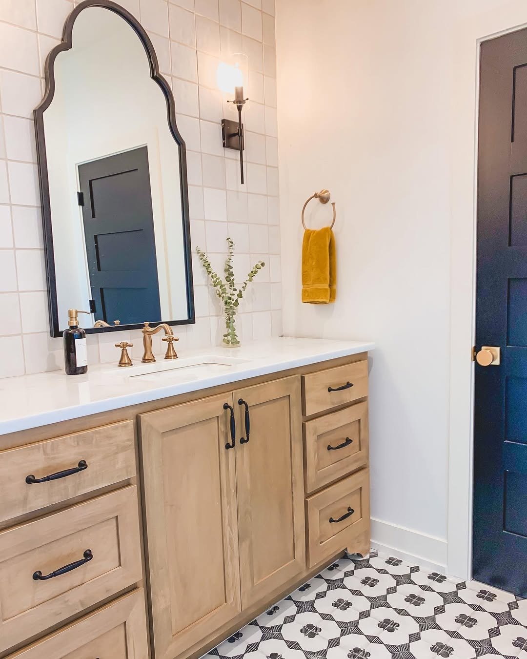 Sometimes it’s the simplest pattern that makes the biggest impact. That tiled accent wall behind the vanity adds just enough structure to break up the softness of the wood cabinetry.