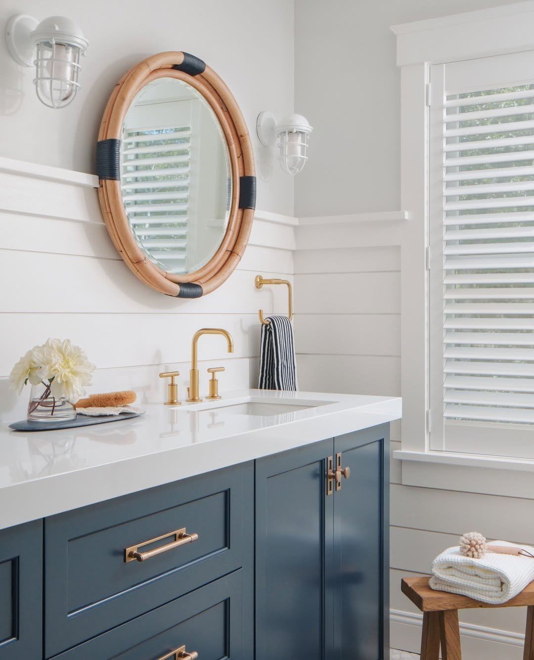 This one has that effortless coastal energy. The horizontal shiplap wall keeps things light and relaxed, while the deep blue vanity adds a grounded, slightly bold contrast.