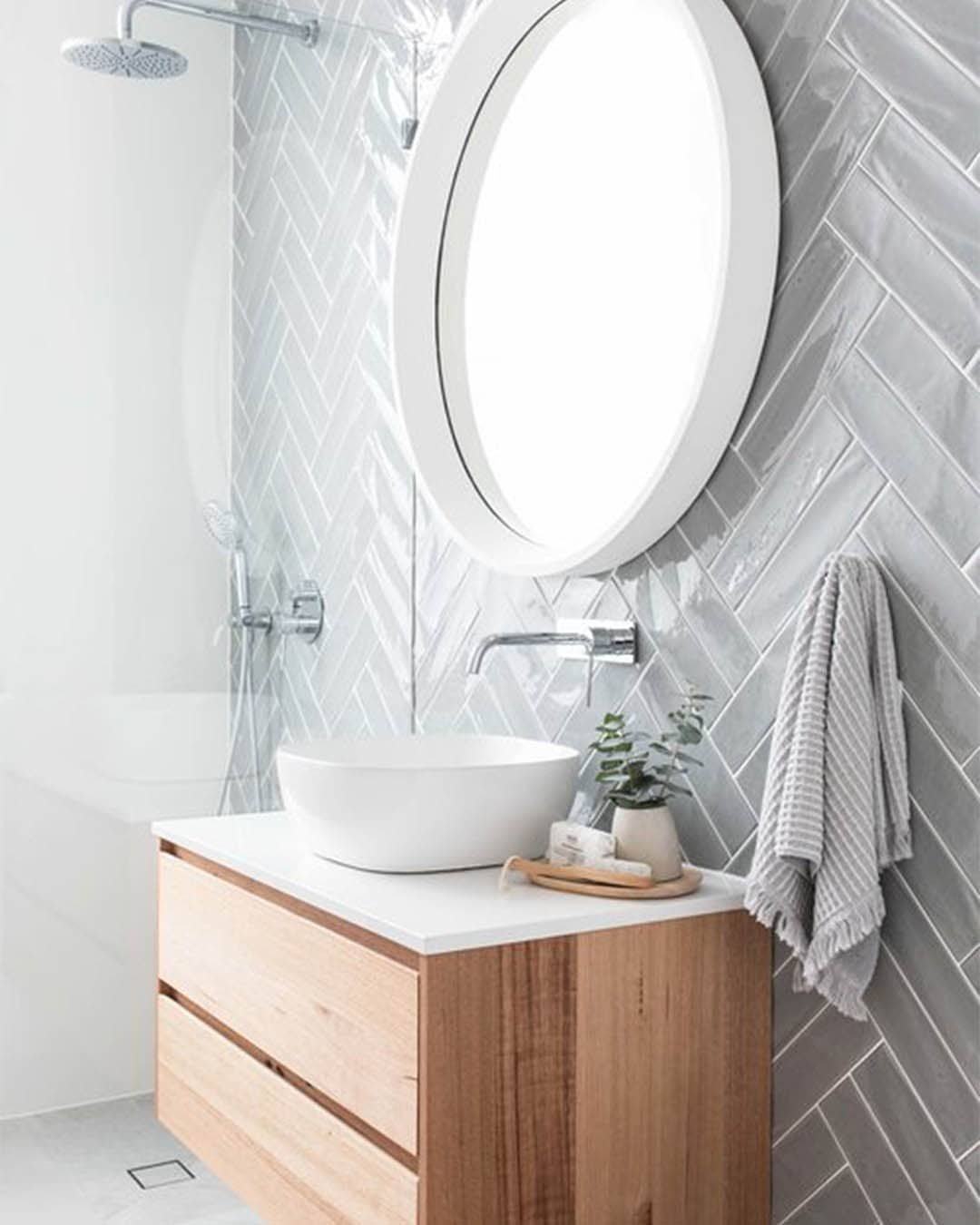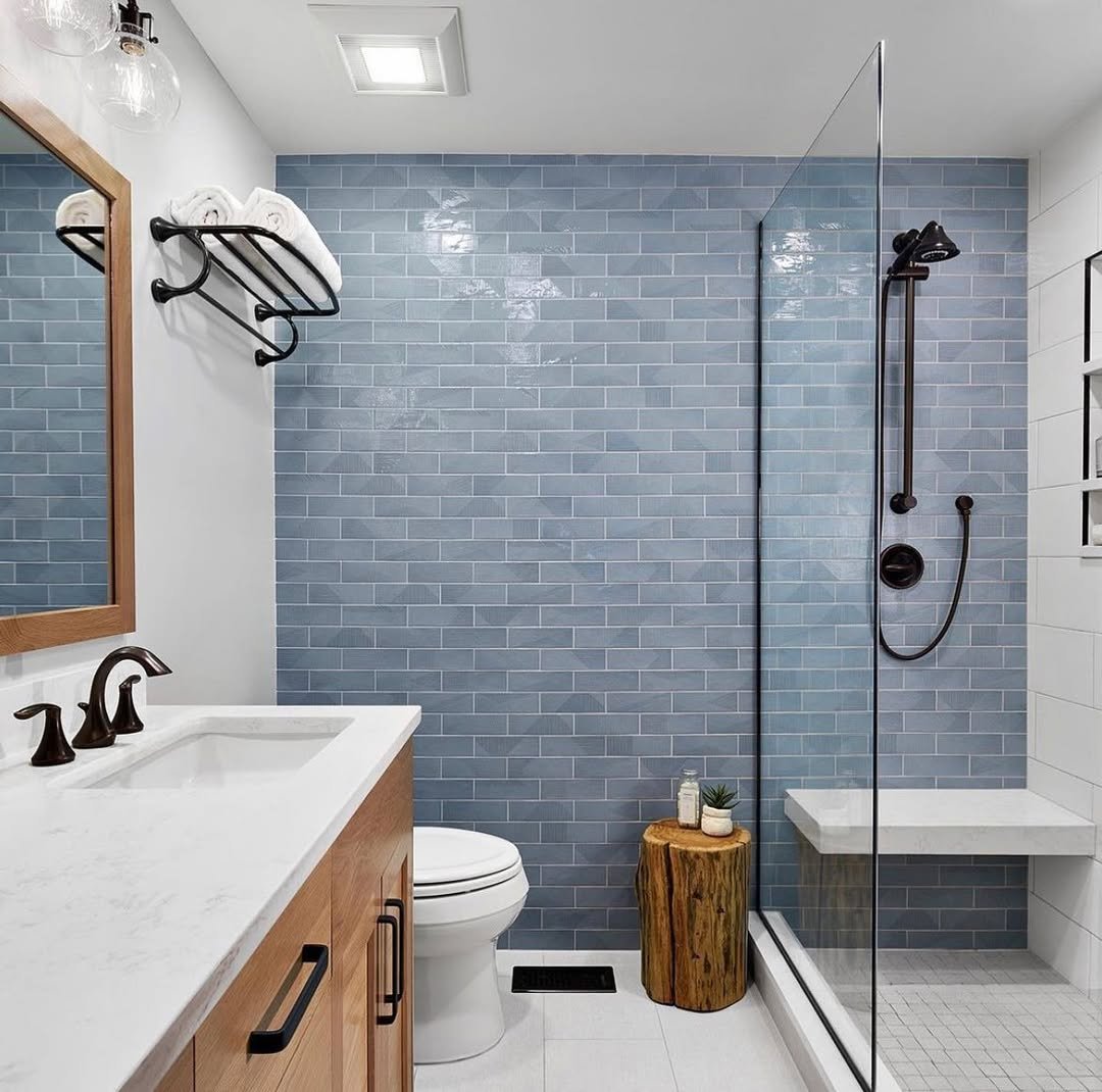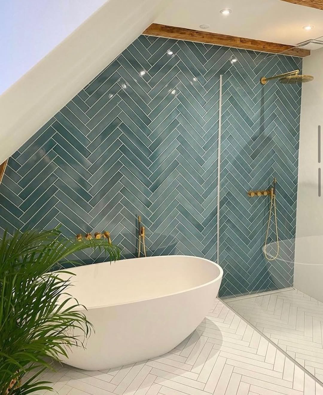 This angled tile layout is doing more than you think. The herringbone pattern adds movement, while that muted blue tone keeps things soft and elegant.