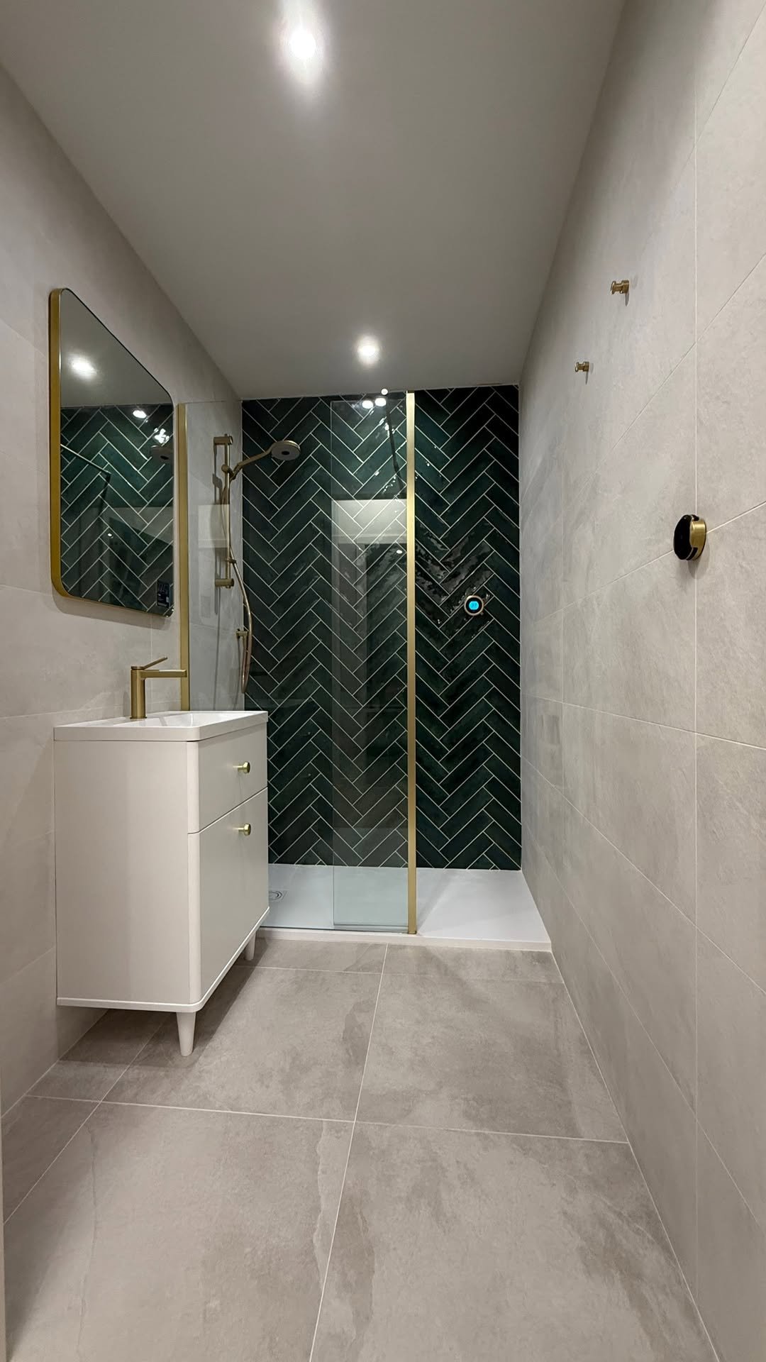 That deep green herringbone wall brings all the drama—but in a sleek, modern way. It draws your eye straight into the shower and gives the space a sense of depth.