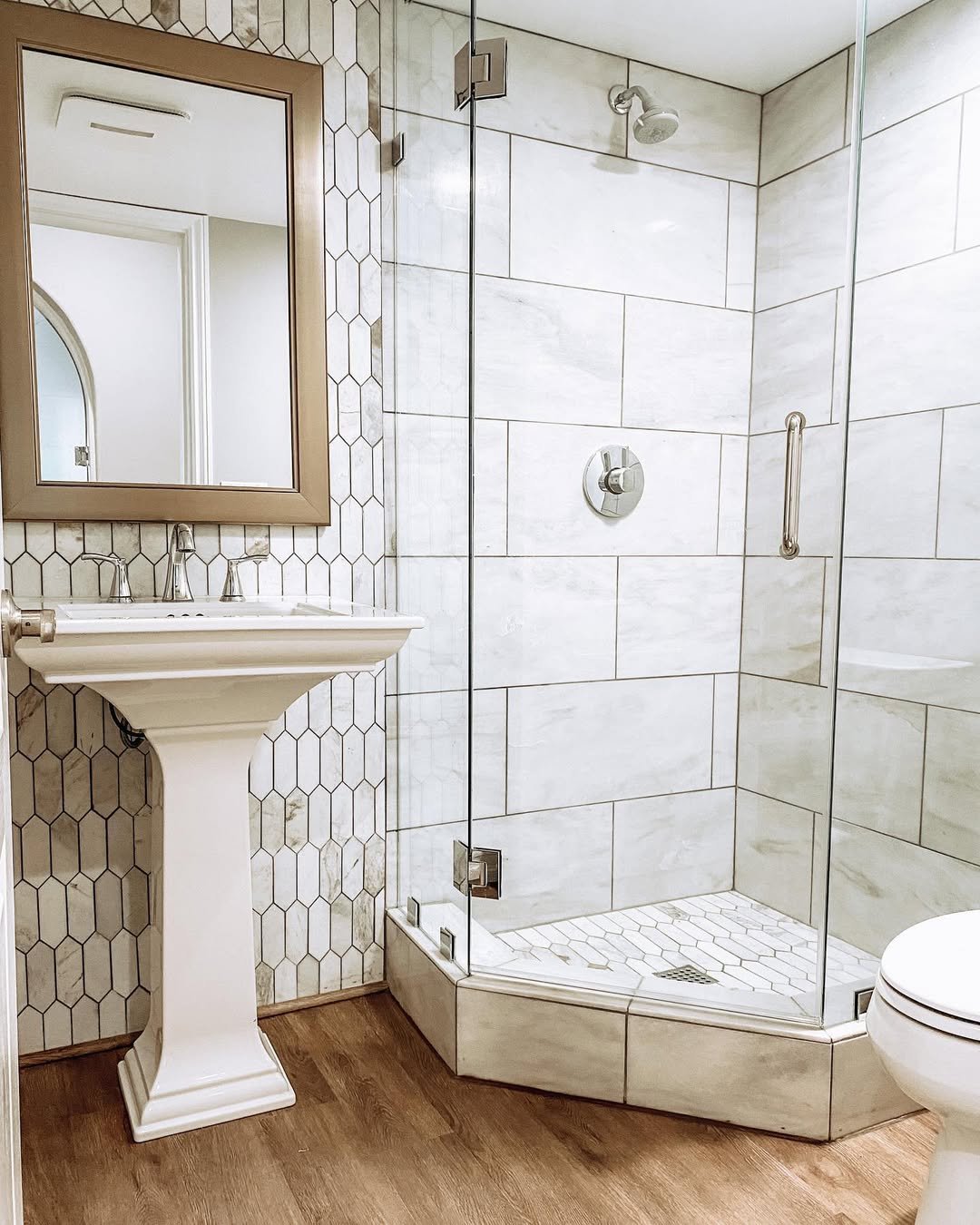 The warm brass lighting and classic pedestal sink give it that timeless touch. It’s fresh, familiar, and quietly charming in the best way.