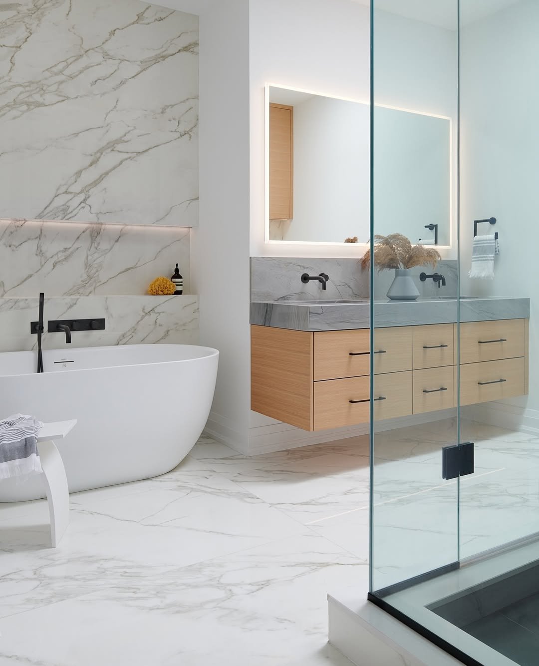 This one is all about letting the material do the talking. That full-height marble accent wall feels luxurious without trying too hard—those soft veining details add just enough movement to keep things interesting.