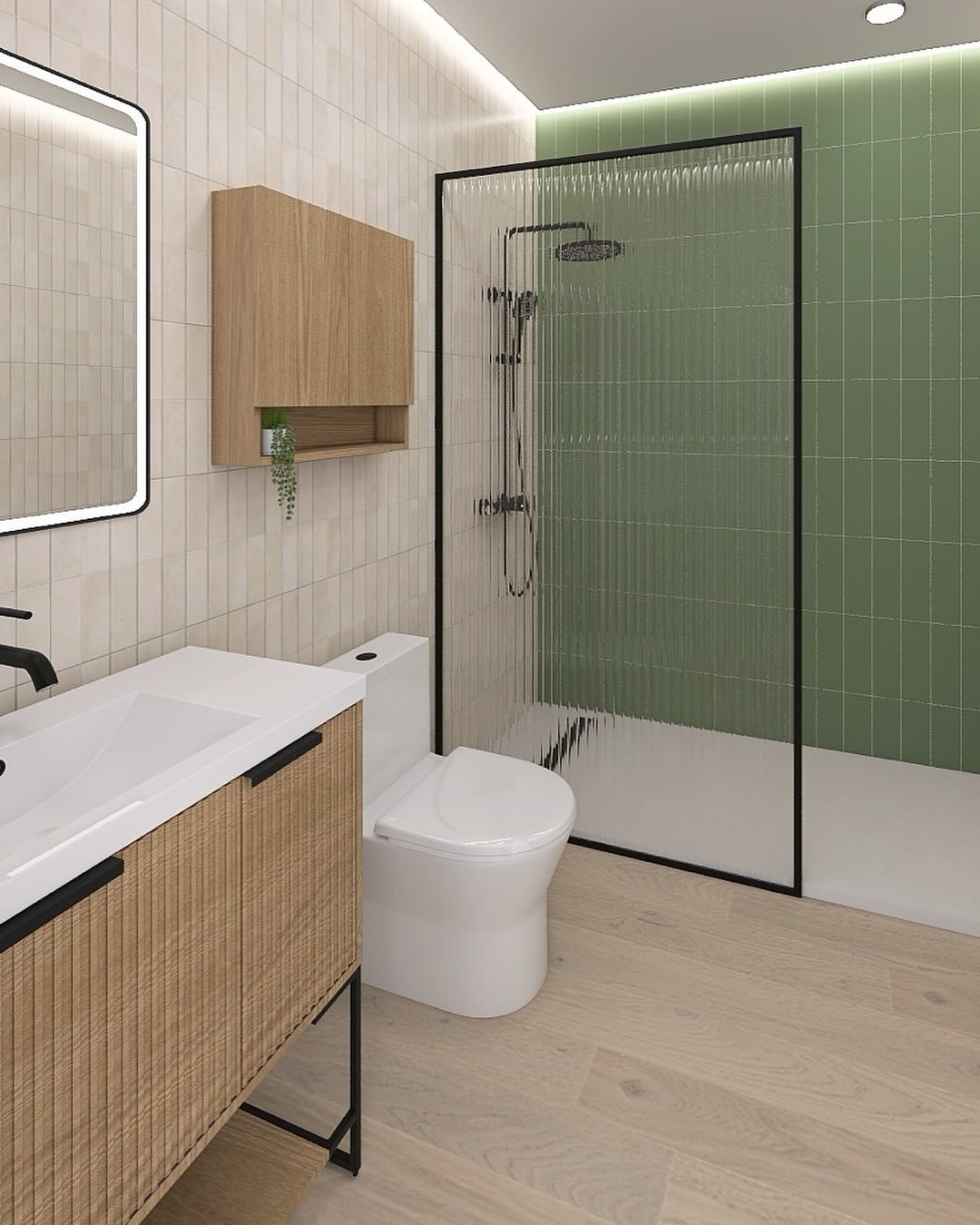 This one plays with contrast in a really smart way. The soft neutral tiles meet that muted green panel wall, creating a clean, modern split.