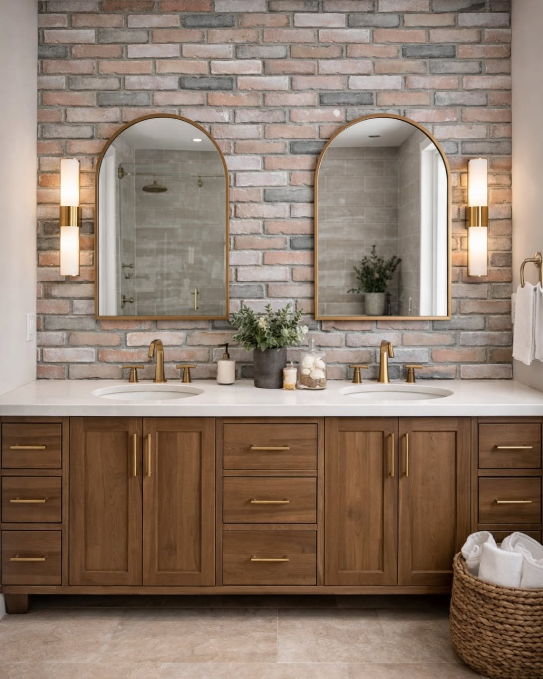 Brick in a bathroom? Yes, and it works so well here. That warm, textured wall adds instant character and contrast against the clean vanity setup.