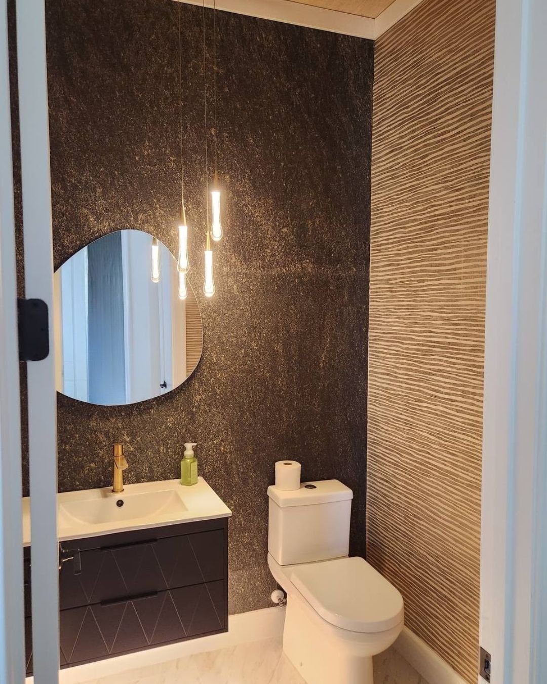 This accent wall leans into texture in the best way. That deep, almost metallic finish adds richness and depth, especially with the soft pendant lighting glowing against it.