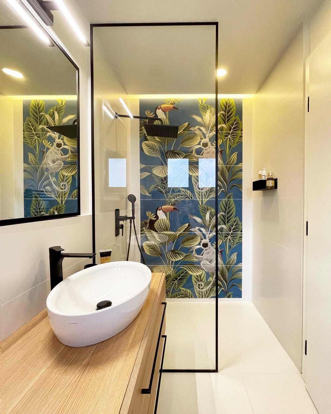 Okay, this is where things get fun. That bold jungle mural instantly turns the shower into a full-on statement moment—like stepping into a boutique resort.