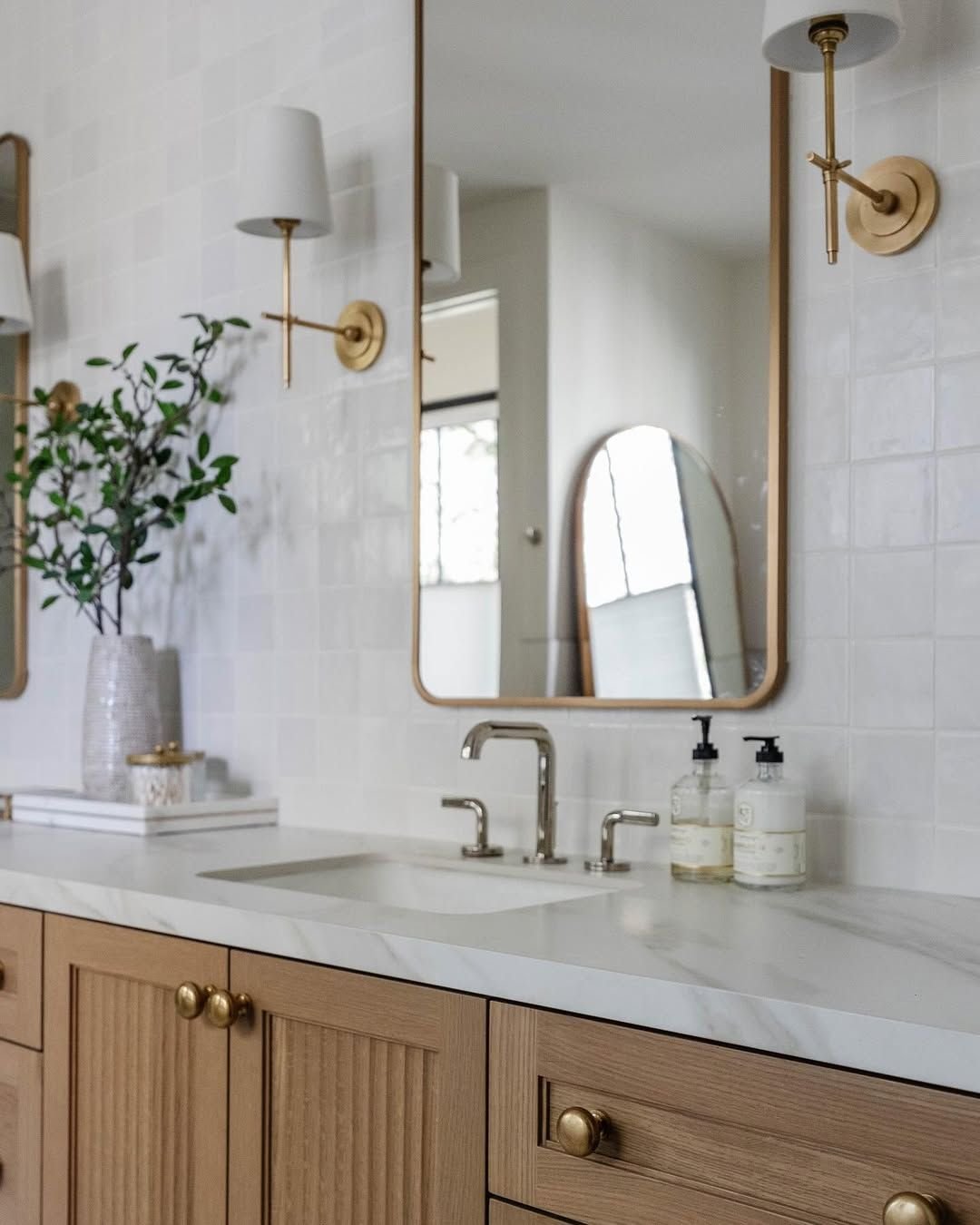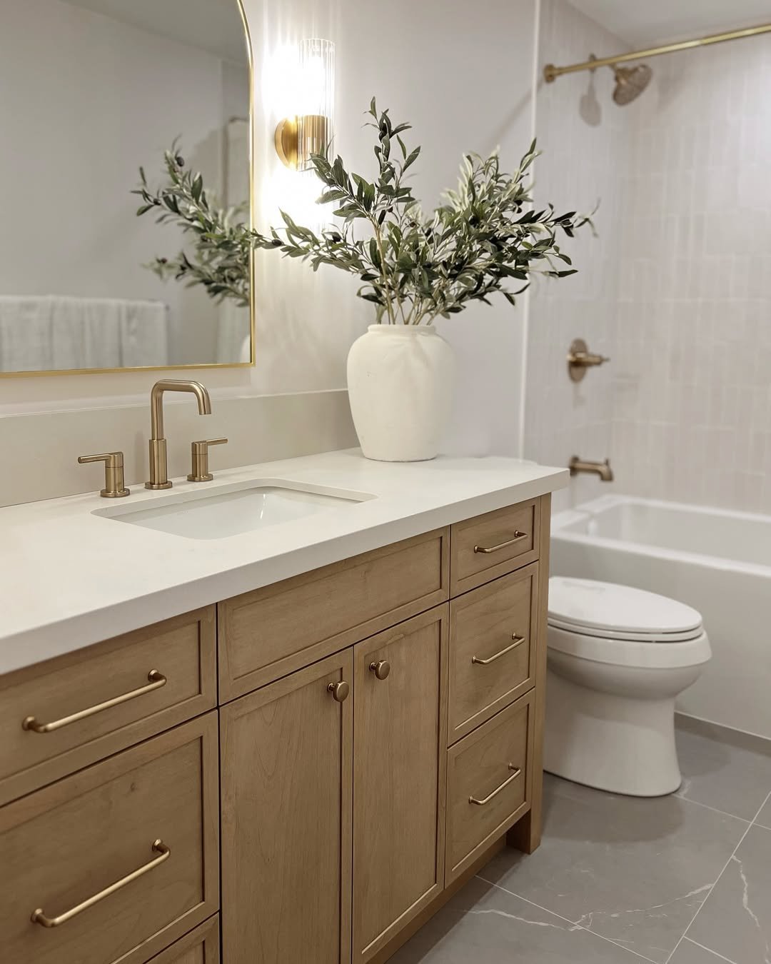 This space feels effortlessly put together. The warm wood tones and brushed gold fixtures set a cozy foundation, while a single leafy arrangement adds life without cluttering the counter.