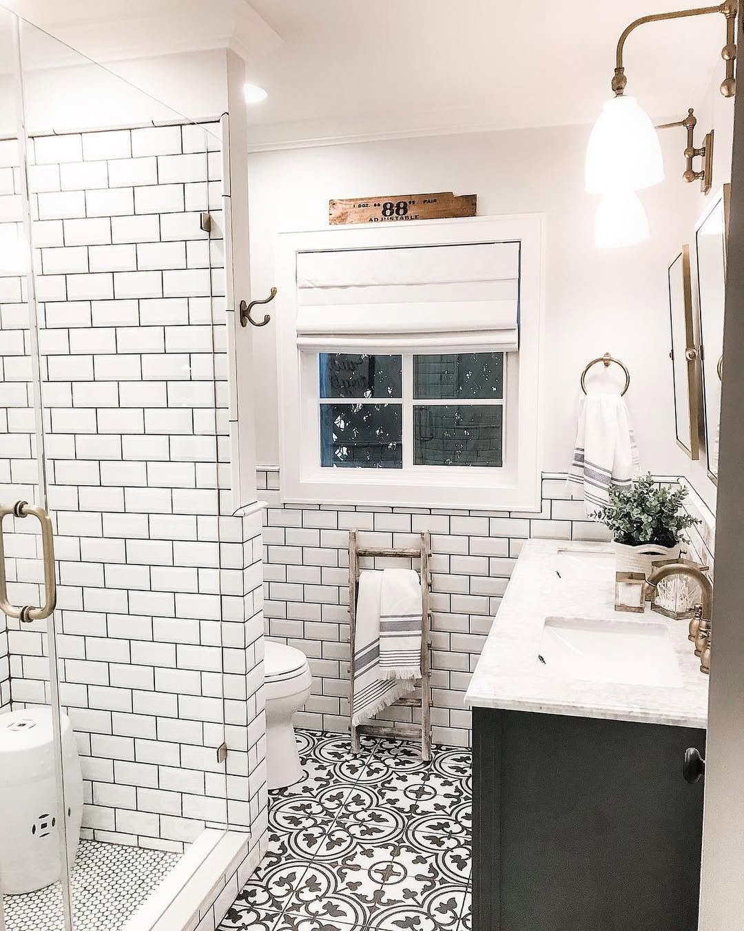 This one leans into that timeless farmhouse charm without feeling overly styled. The mix of subway tiles, patterned flooring, and soft brass fixtures creates the perfect backdrop for simple countertop decor—nothing loud, just intentional. A small plant, a tray, and neatly folded linens do all the heavy lifting here.